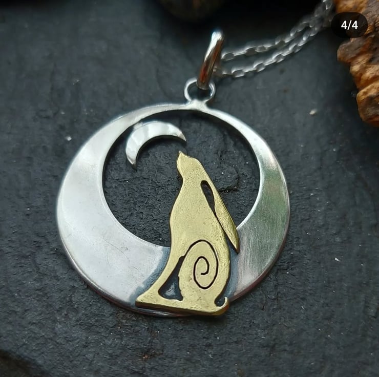 A lovely silver hare and moon necklace , in a crescent moon circle.This is a solid sterling hare and moon handsawn pendant with a shiny finish ,a solid brass hare, crescentmoon shaped backplate behind a standing hare with a little crescentmoon in the sky . Lightweight and comfortable and catches the light .