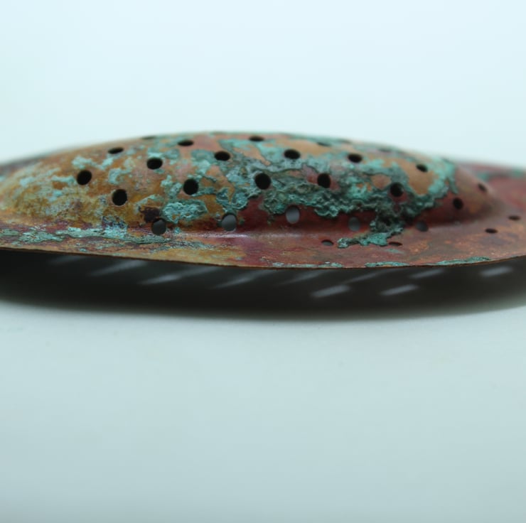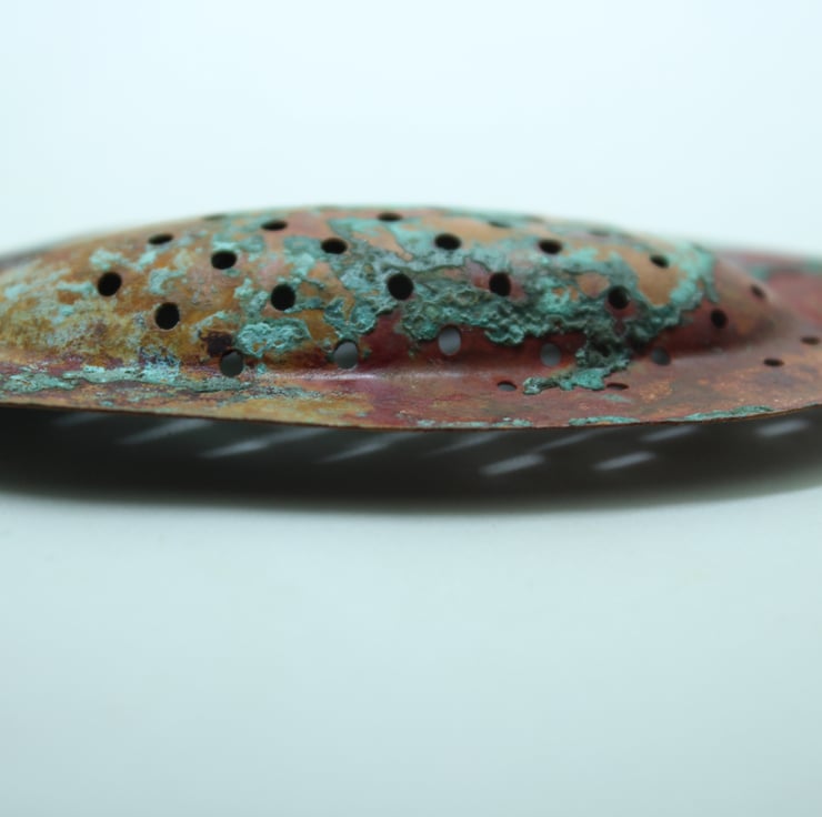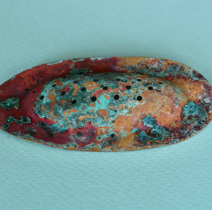 Celebrate the raw beauty of copper with this handcrafted brooch, featuring striking verdigris tones developed through natural patination.