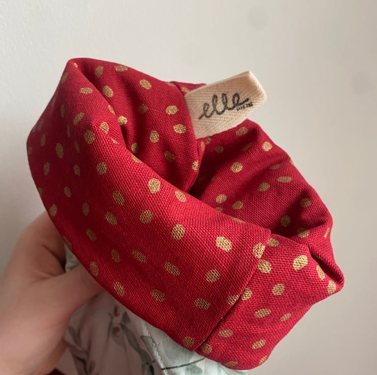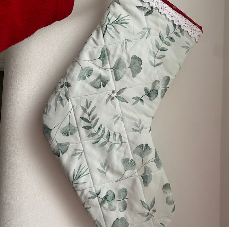 Quilted green botanicals for the shell, with red and gold polka dot canvas lining. Perfect for hanging on a wall or fireplace over the festive period! Can be filled.