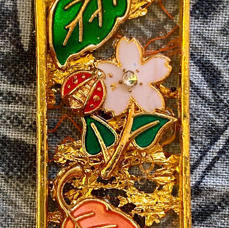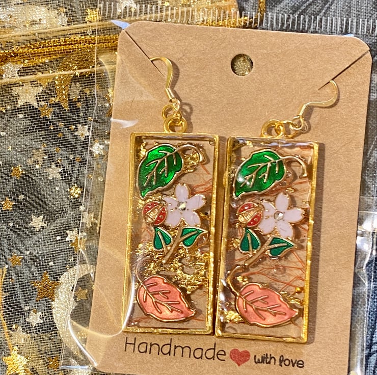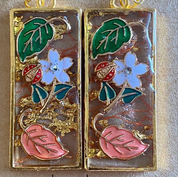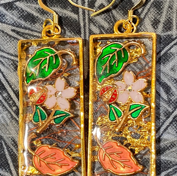 This is a pair of drop gold-rimmed earrings with cloisonne leaves and flowers in resin on a background of orange and gold mesh. The hooks are made from 18ct gold. They are posted via Royal Mail 2nd class post.