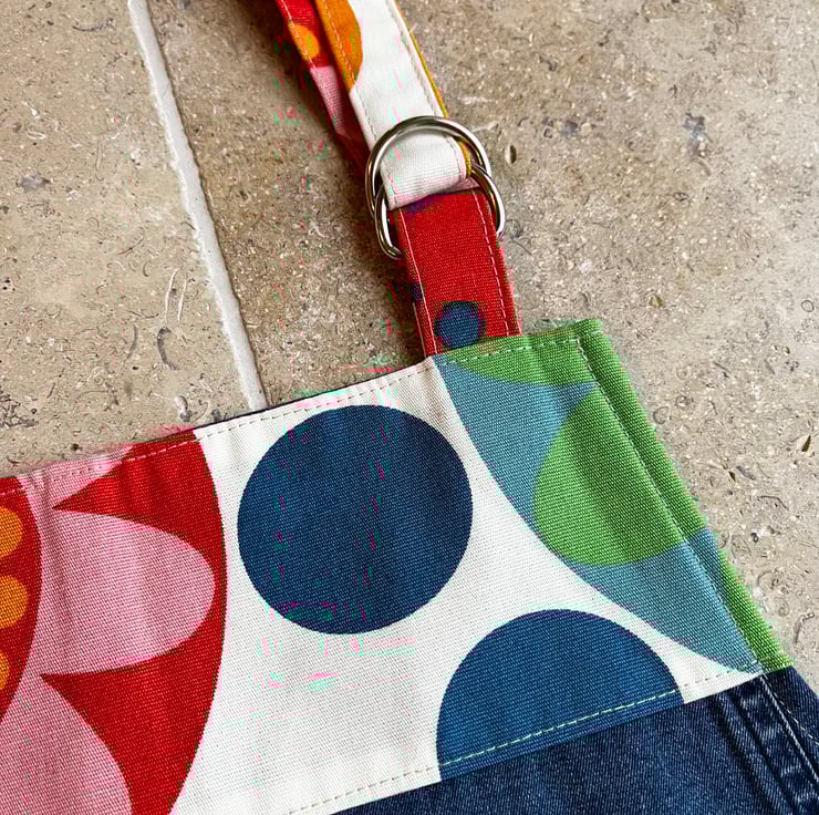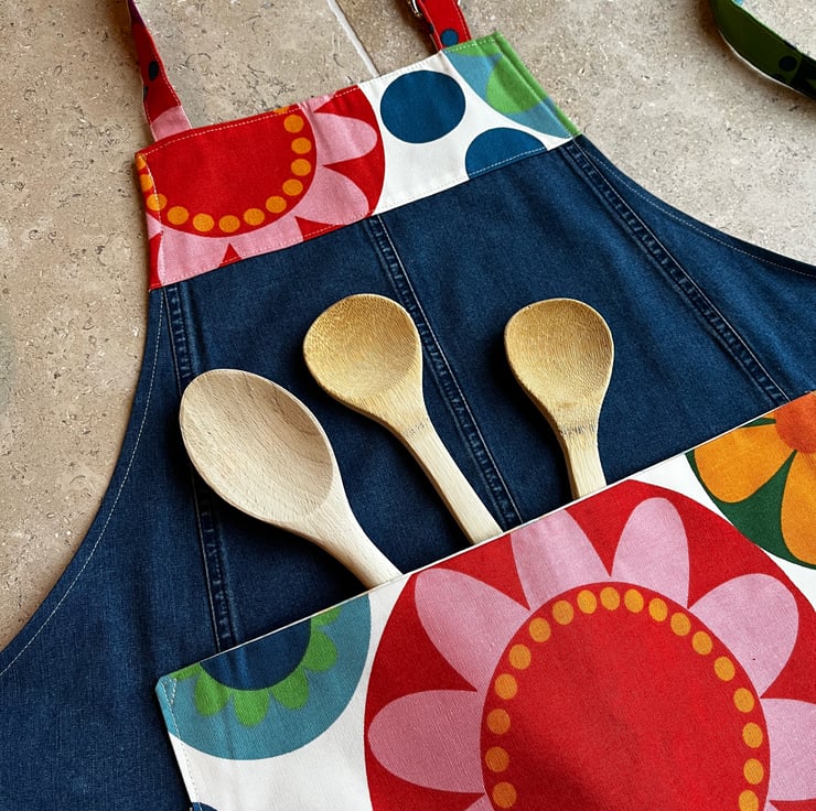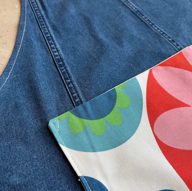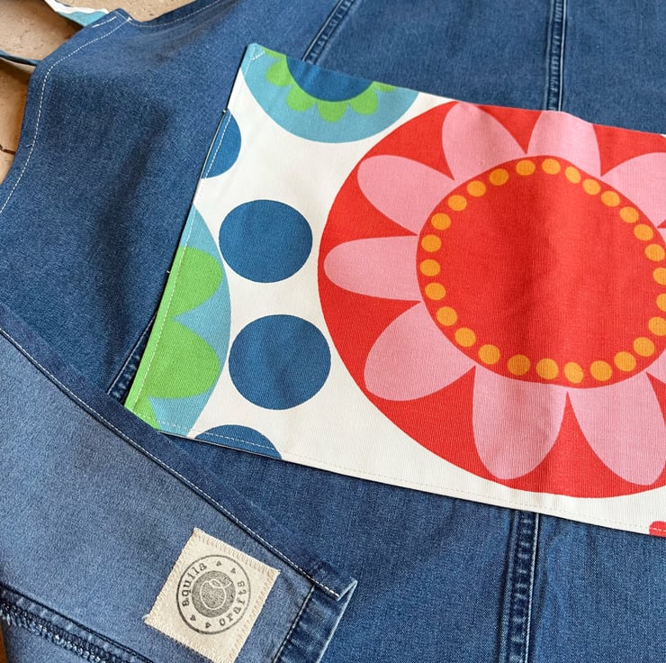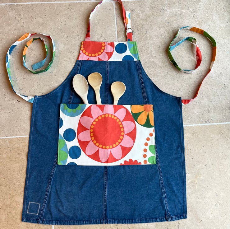Unique apron made from a mid-weight denim skirt and colourful ikea fredrika cotton. The denim is soft and the seams from the skirt give an interesting feature. Fredrika cotton with its bold retro pattern is used for the straps, bib and pocket.