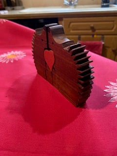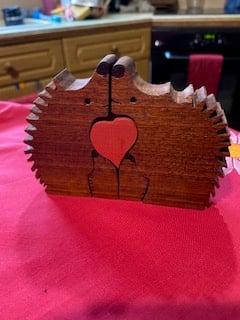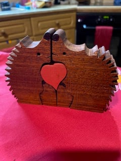 Made from Sapele, this is a hedgehog family group, with a central heart.