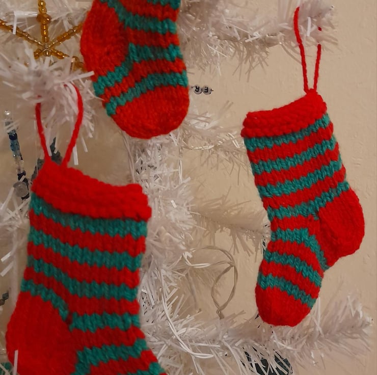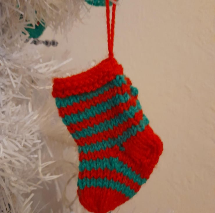 Beautifully hand knit striped Christmas stocking ornament for the tree or packages. Knit by me in a pet and smoke free home with new yarn, as pictured. Sized around 4.5" X 2" Perfect for coworkers. (Sold individually, as 3 ornaments, not in pairs and not to be worn by children).