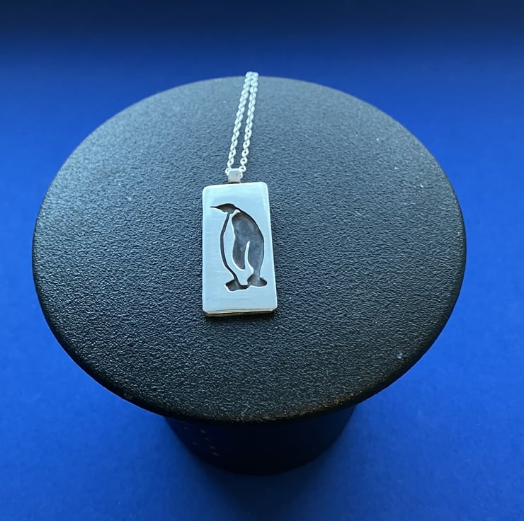 Sterling silver hallmarked pendant made in a small Sheffield studio. The penguin has been hand pierced from a sheet of silver and soldered onto another piece of silver sheet. Some of the cut-out piece has then been soldered back into the image to give a more realistic picture. It has then been oxidised to give definition to the image. It is attached to the chain via a small silver tube soldered onto the top edge.