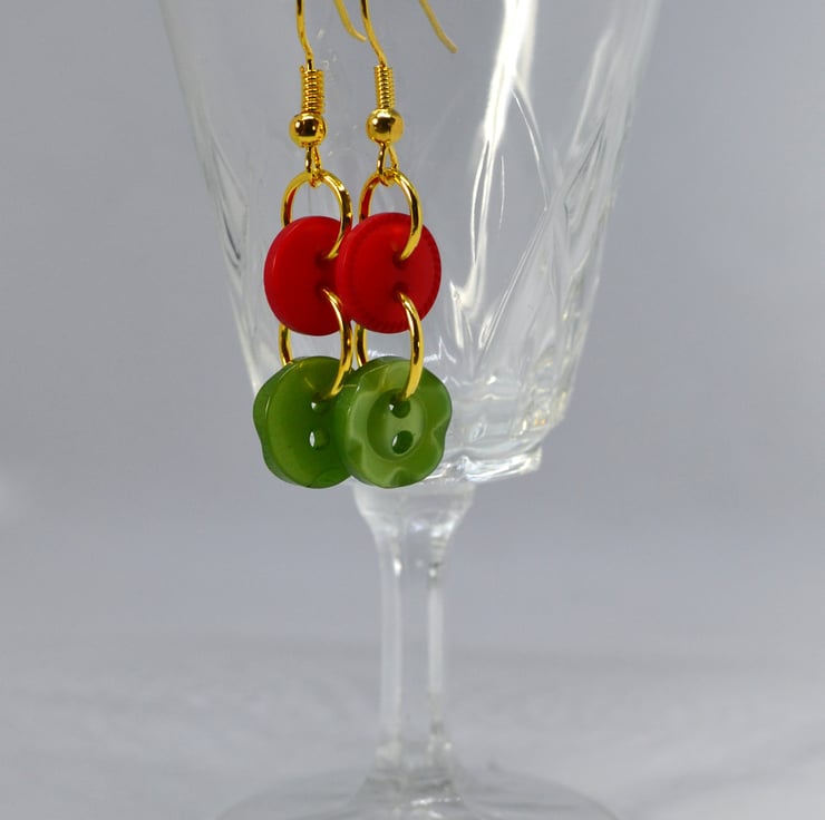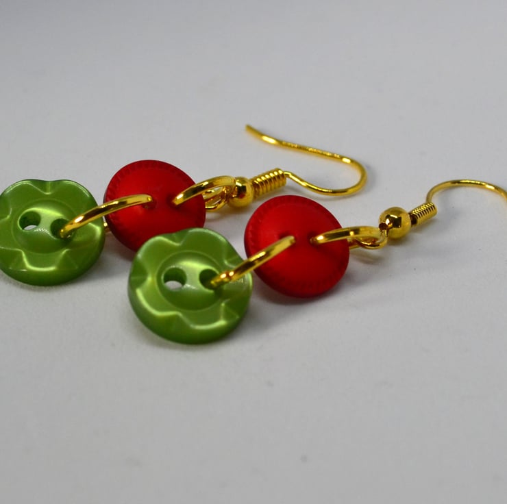 A pair of light weight earrings made using red and green buttons and gold plated findings. They are approx. 2.5cm from the base of the ear wires. A lovely little fun pair of inexpensive earrings for wearing during the festive season.