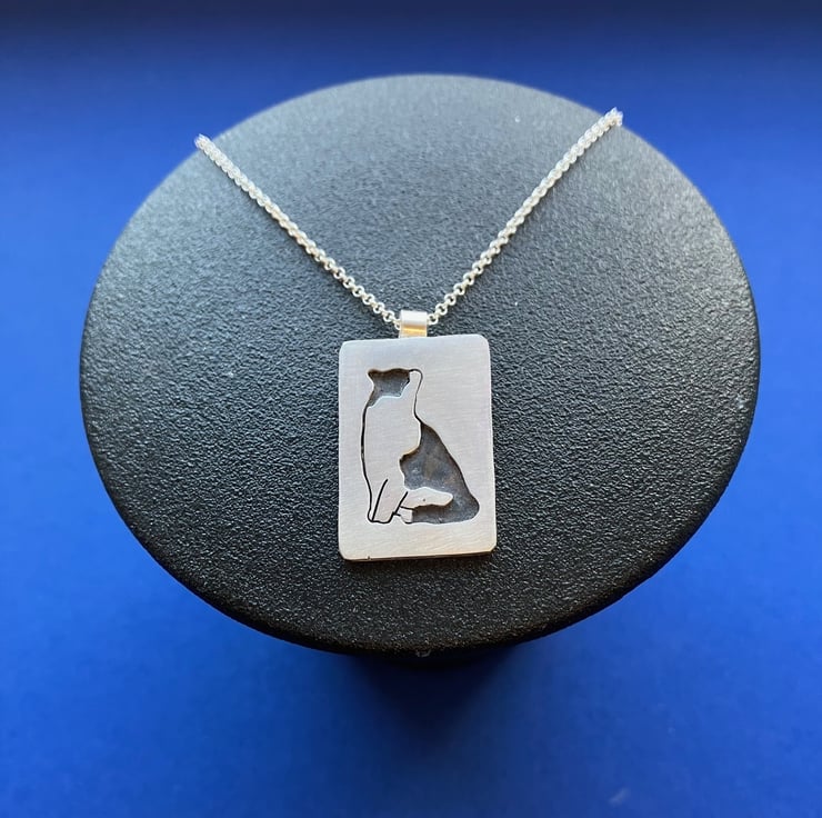 Sterling silver hallmarked pendant made in a small Sheffield studio. The cat has been hand pierced from a sheet of silver and soldered onto another piece of silver sheet to give a background. Some of the cut-out piece has then been soldered back into the image to give a more realistic picture. It has then been oxidised to give definition to the image. It is attached to the chain via a small silver tube soldered onto the top edge.