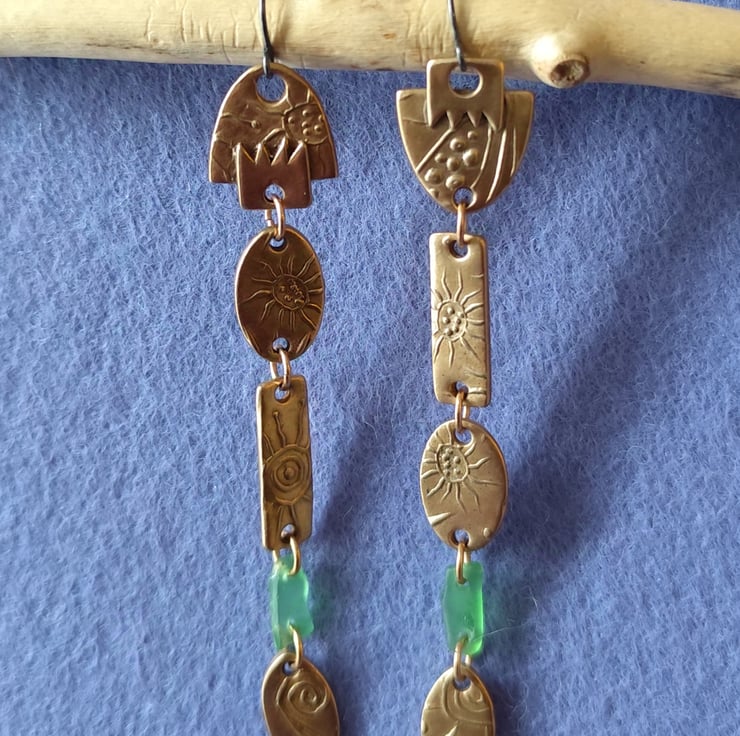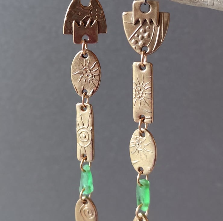 Seaglass shoulder duster earrings, bronze unique jewellery, recycled material