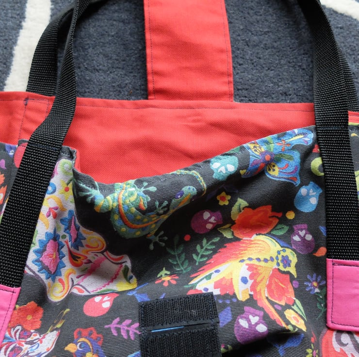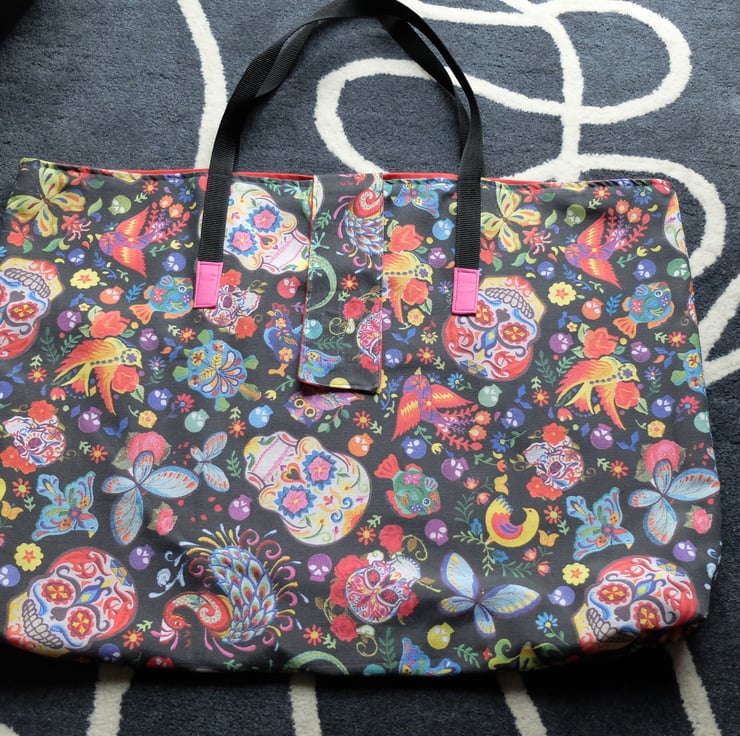 This is a bag for a large backgammon board in Day of the Dead / Skulls canvas fabric.