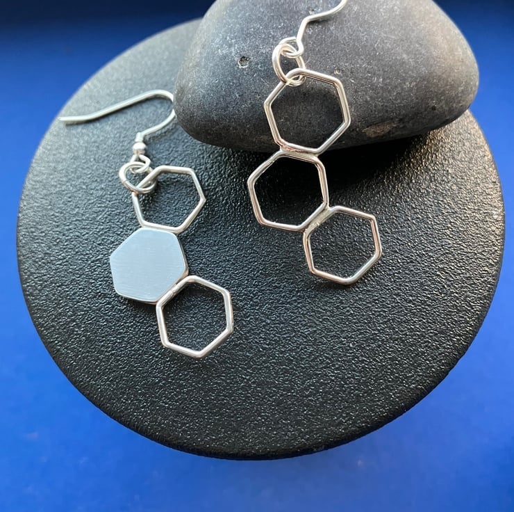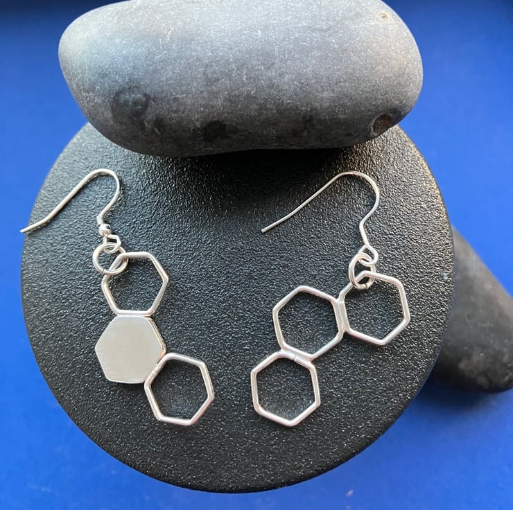 Sterling silver earrings made in a small Sheffield studio. These earrings are comprised of three hexagons soldered together to create a honeycomb pattern, one of the hexagons is solid silver the rest are made from wire. One earring has a small sterling silver bee soldered to it. They are made from 1.2mm sterling silver wire and are 1.7cm at the widest point. They measure 5cm in length.