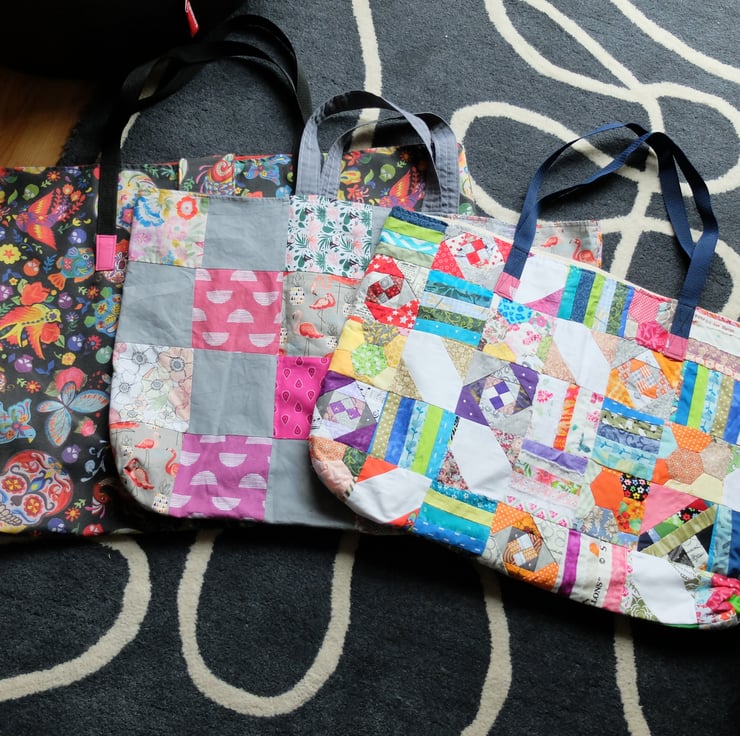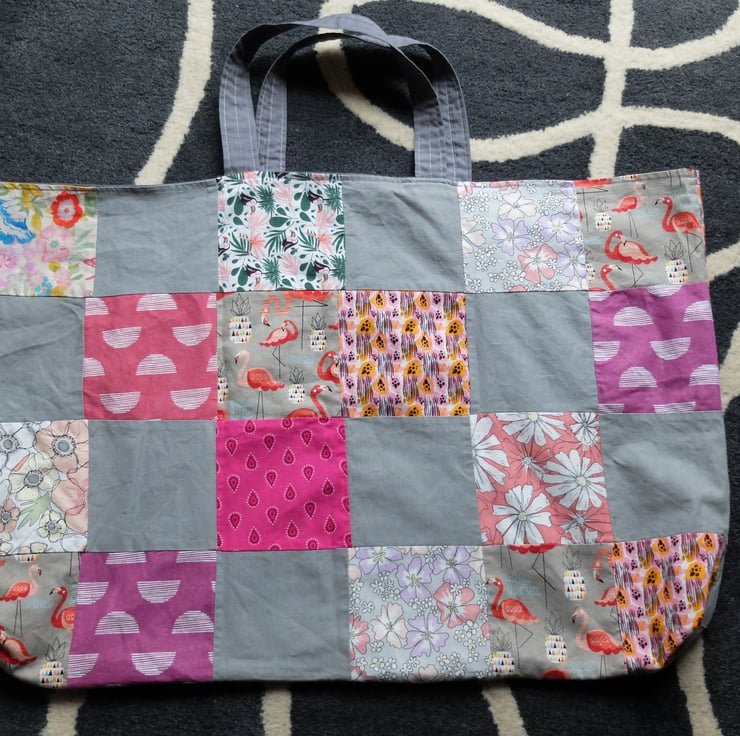 This is a bag for a medium/large backgammon board in pink and grey patchwork squares.