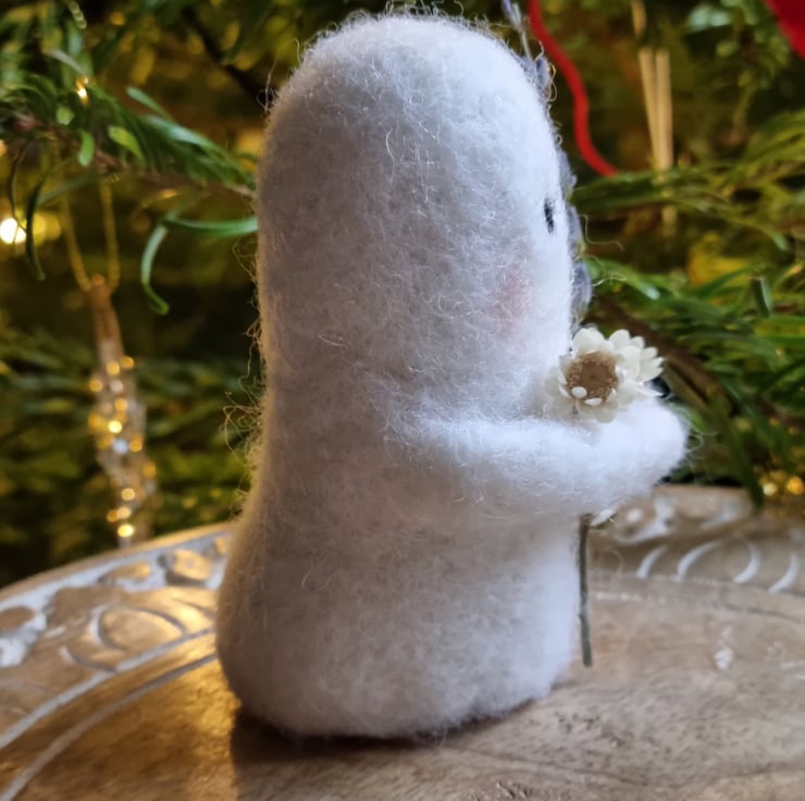 Needlefelted using NZ wool and carrying a bouquet of dried flowers.
