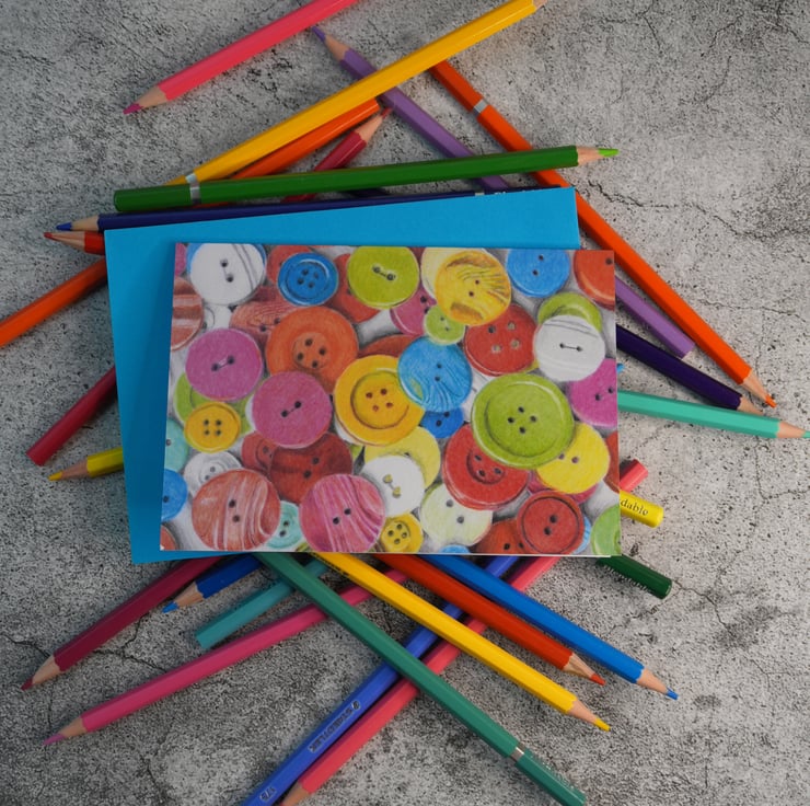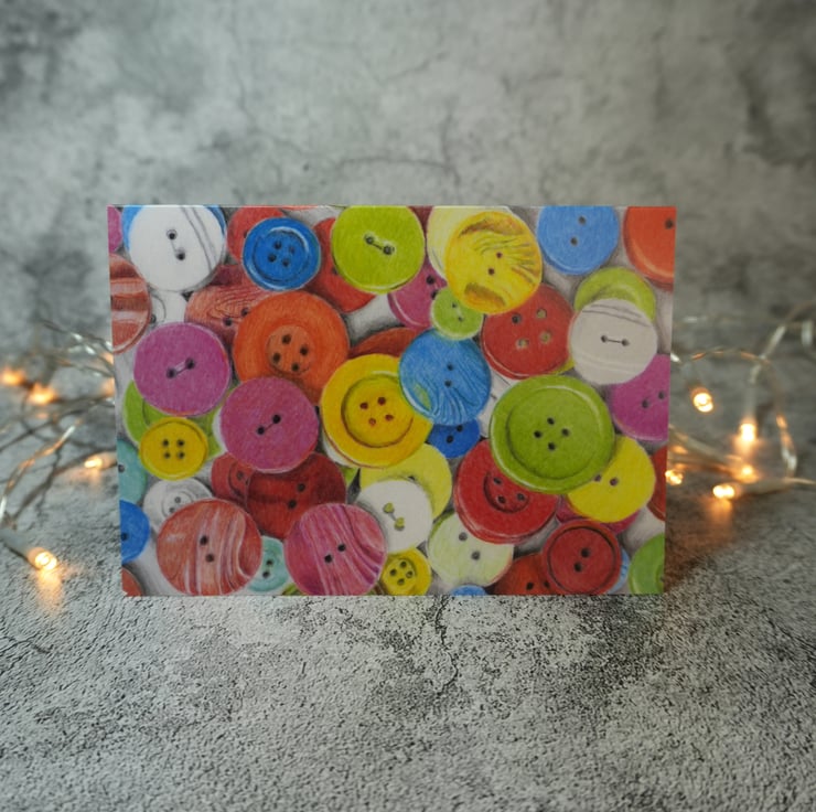 A blank card printed with my original drawing "Nana's Button Box"