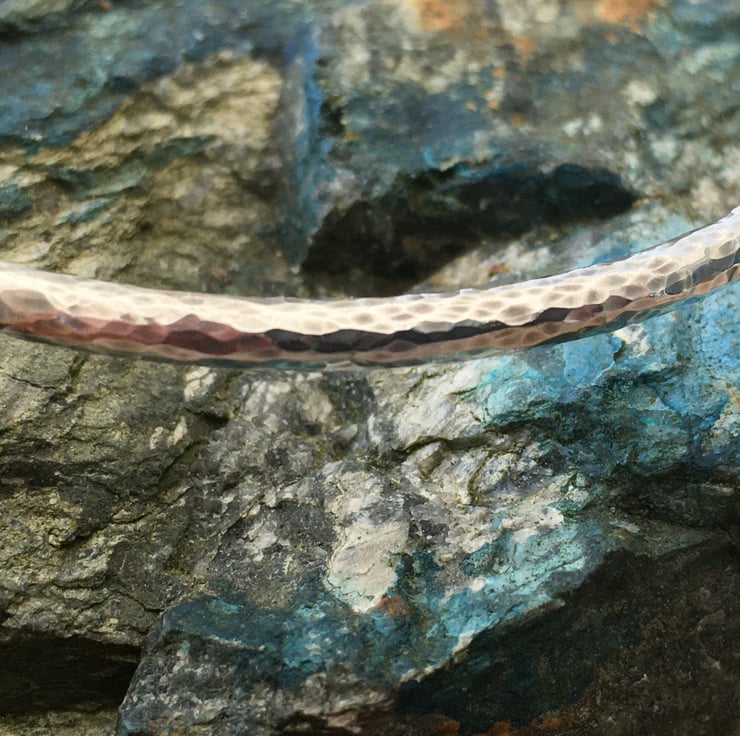 A beautifully crafted hallmarked bangle in 3mm 925 silver, textured to cause light to reflect on the many surfaces resembling the sparkle of sun on the sea.