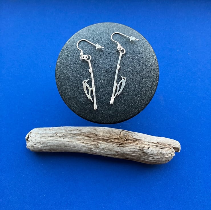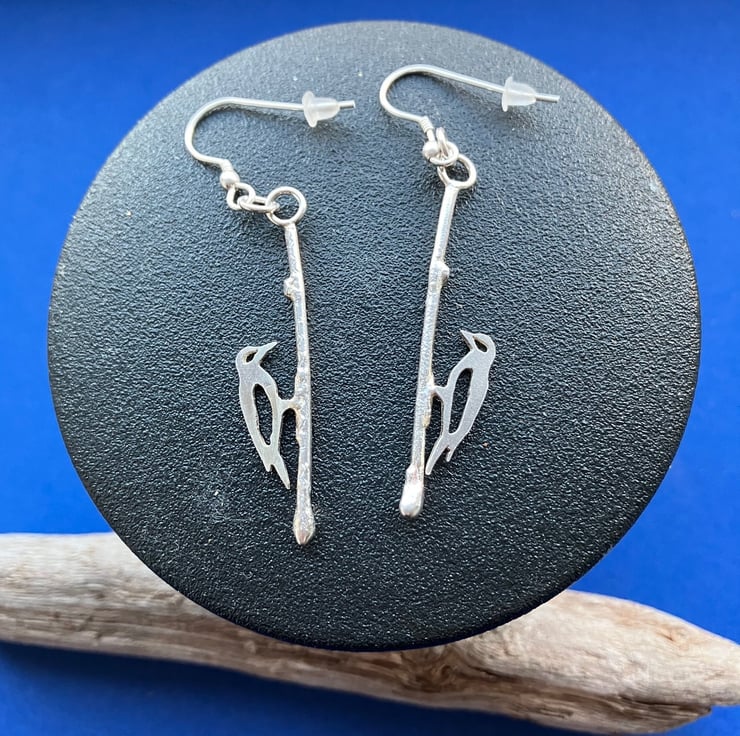 Sterling silver earrings made in a small Sheffield studio. These are drop type earrings and are 6.3cm in length. They are made from wire melted to look like a branch and have a hand pierced woodpecker attached to the branch.
