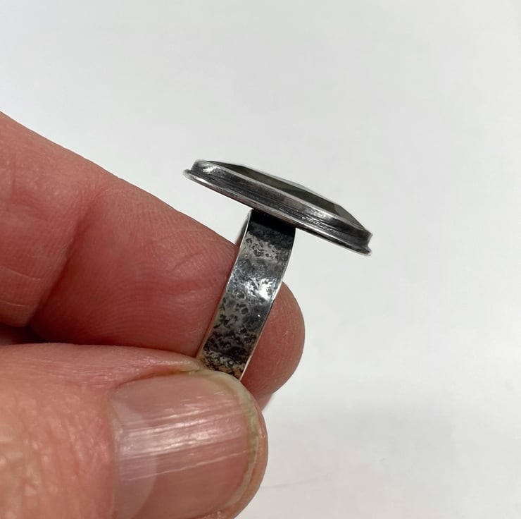 The ring shank is just under 5mm wide, it has a hammer textured surface. The inside of the ring is slightly curved, making it a comfort fit.