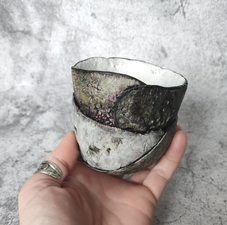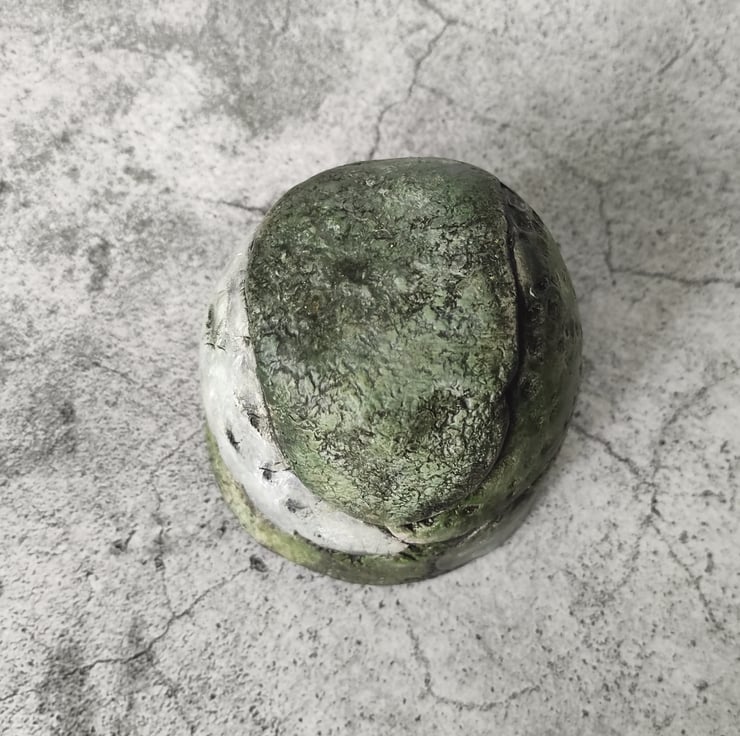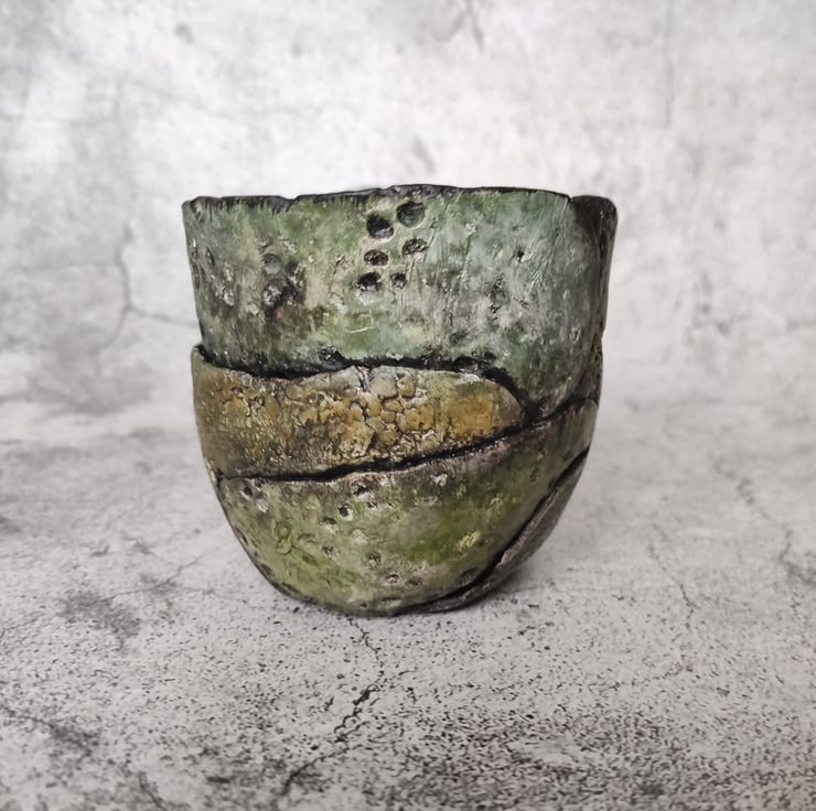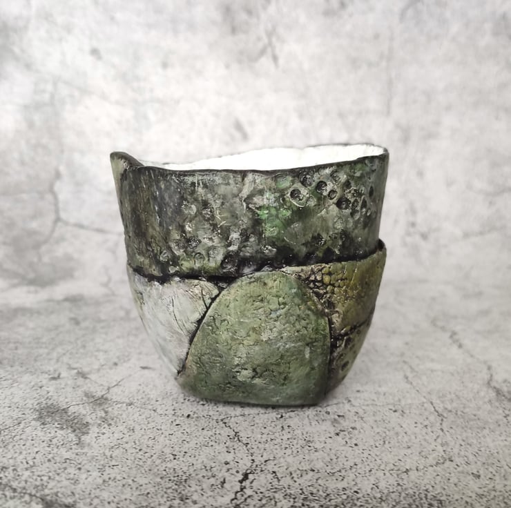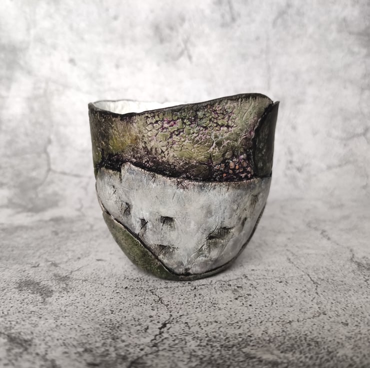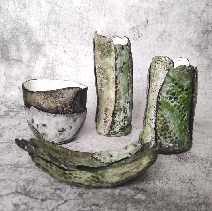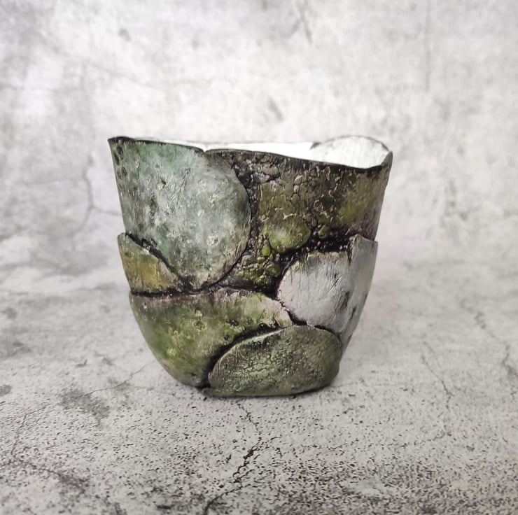 I've incorporated many different textures on the surface of my 'living slabs' of clay, making my vessel super tactile! Hand painted in soothing shades of green and grey inspired by tree bark and moss and lichen on stone.