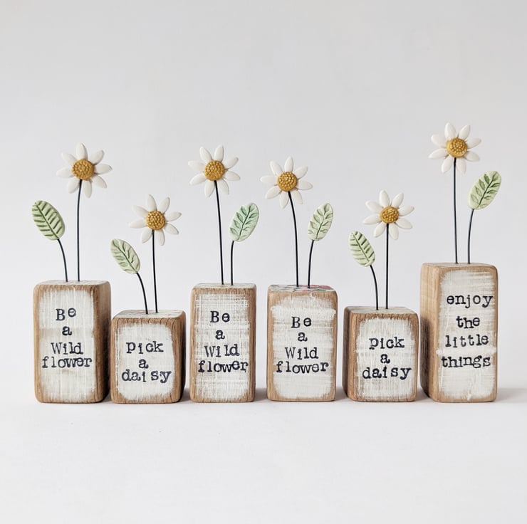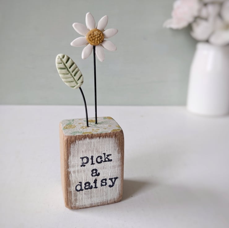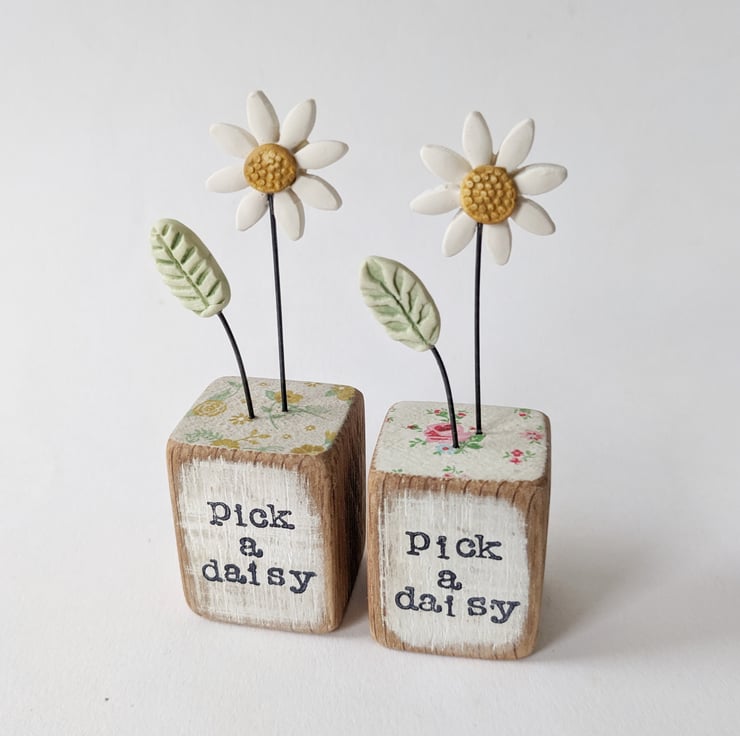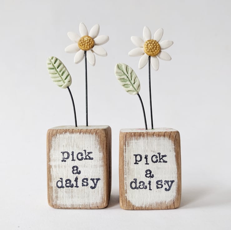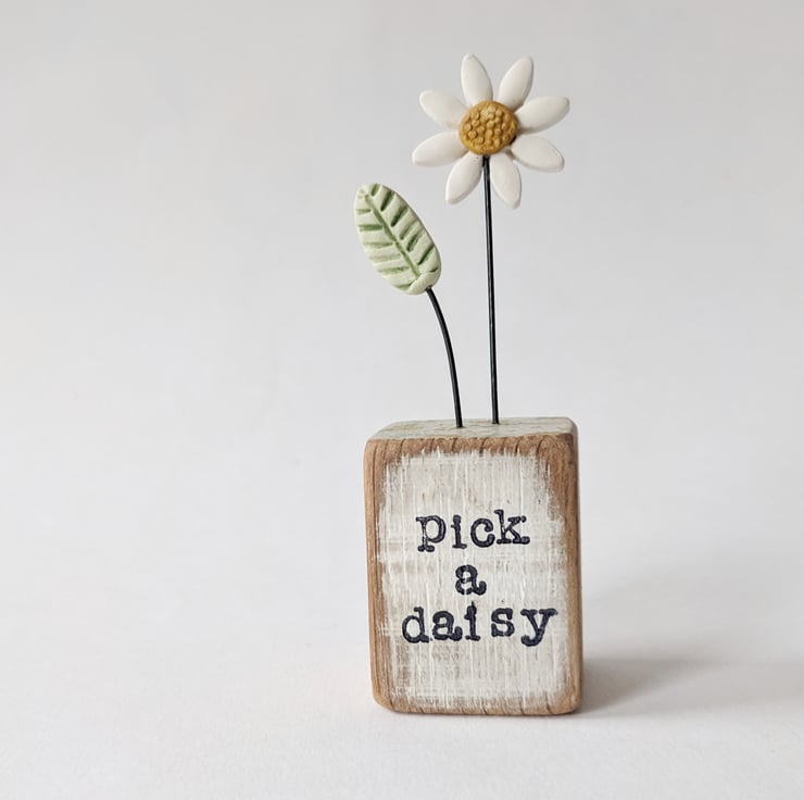 The front of the wooden block is hand stamped with the words 'pick a daisy'.
