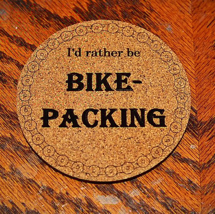This is a listing for a round cork coaster with a statement "I'd Rather be Bike-Packing".