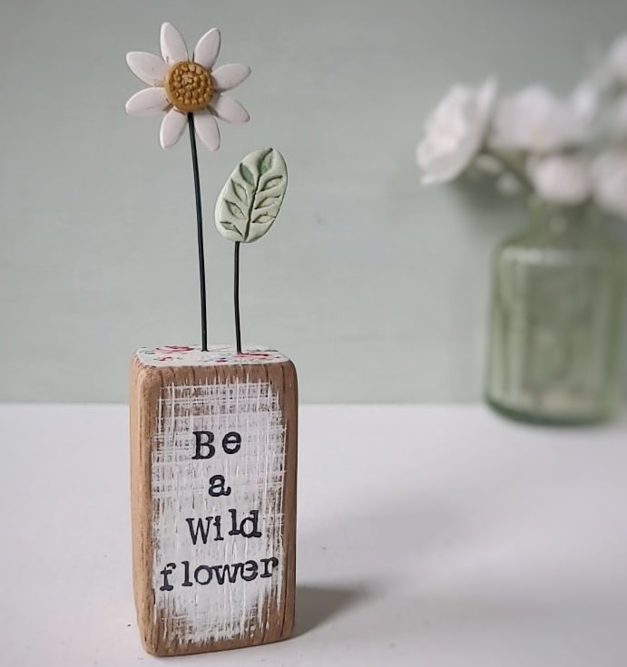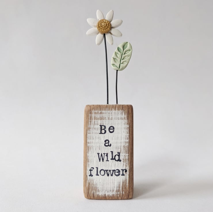 The front of the wooden block is hand stamped with the words 'Be a wild flower'