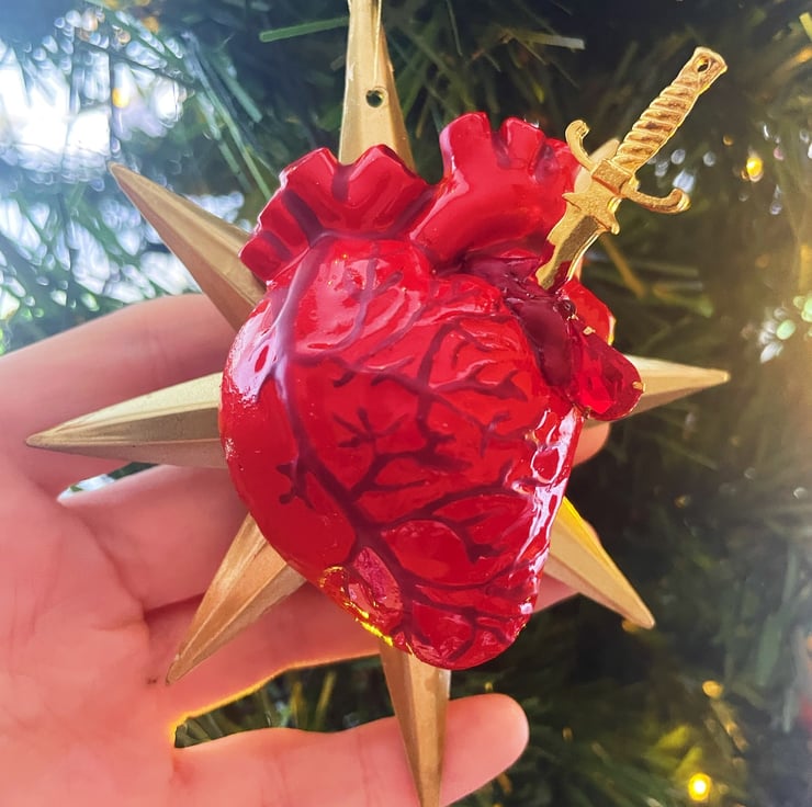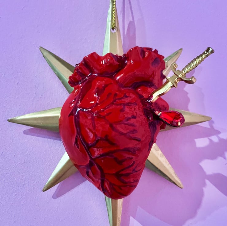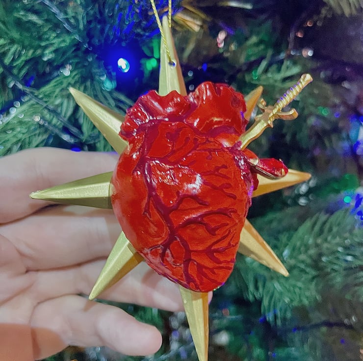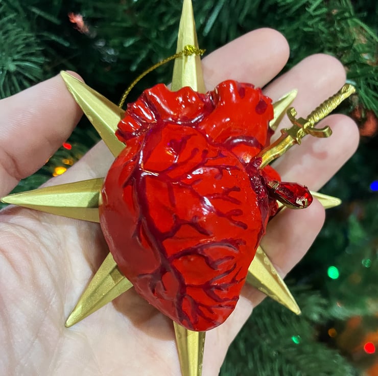 Handmade and hand painted anatomical pierced heart Christmas tree ornament