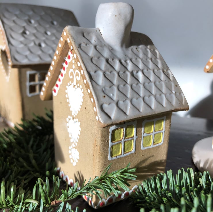 Made from stoneware clay and decorated with a heart stamped textured roof and indented window shapes which have been hand painted with yellow underglaze.