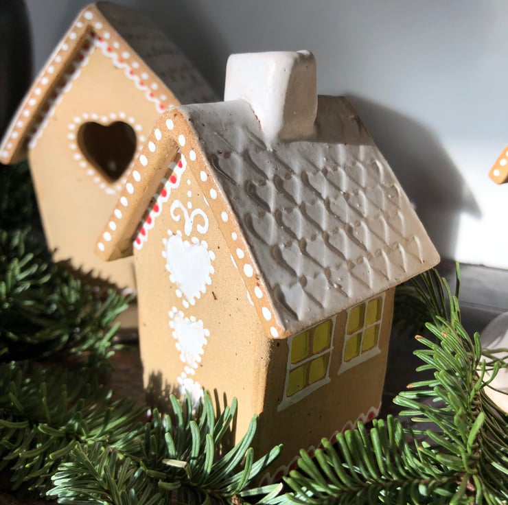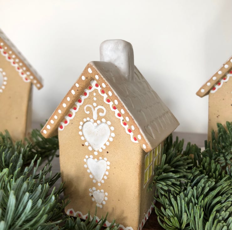 The front and back of the house has a 3 heart stamp shapes which have been hand painted with white underglaze. The snowy roof is a matte white glaze.