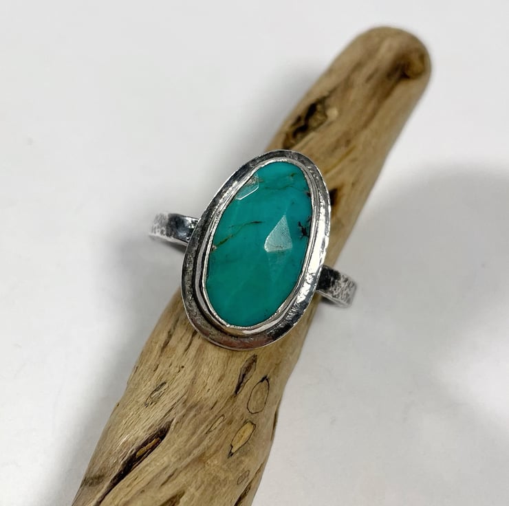 Oval faceted turquoise ring. I have set the turquoise in a simple rub over setting on a slightly wider hammer textured table. The ring shank is textured on the outer edge and is curved, comfort fit inside.