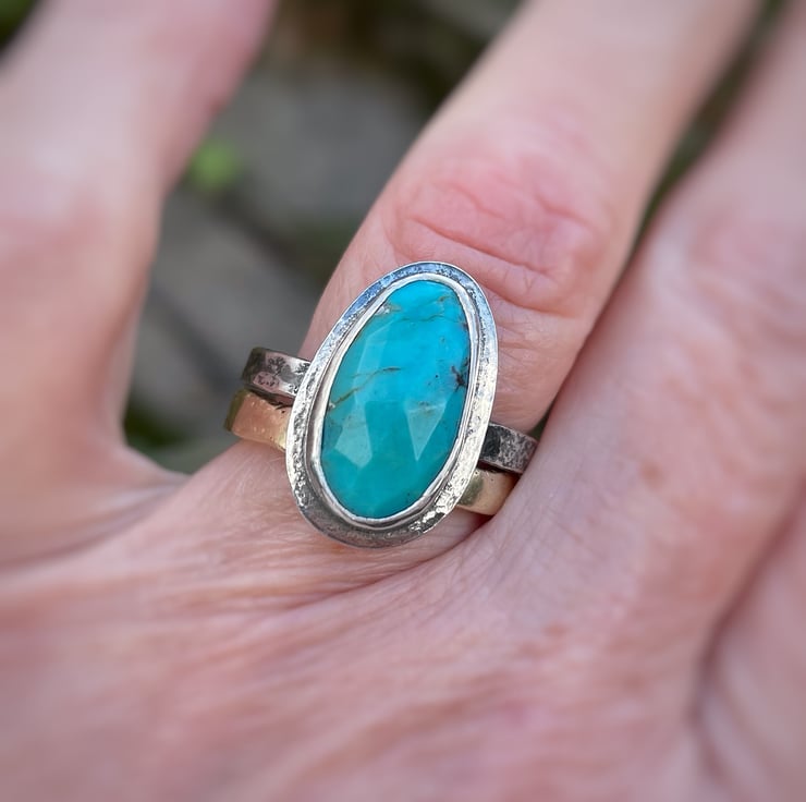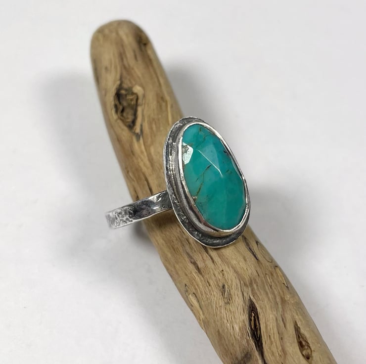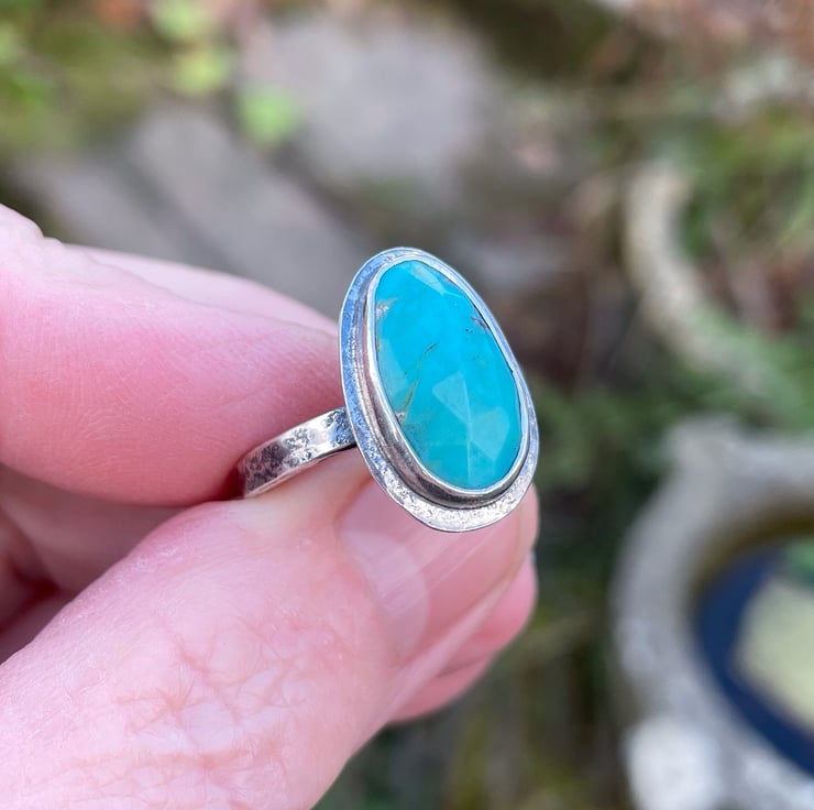 Oval faceted turquoise ring. I have set the turquoise in a simple rub over setting on a slightly wider hammer textured table. The ring shank is textured on the outer edge and is curved, comfort fit inside.