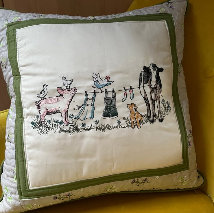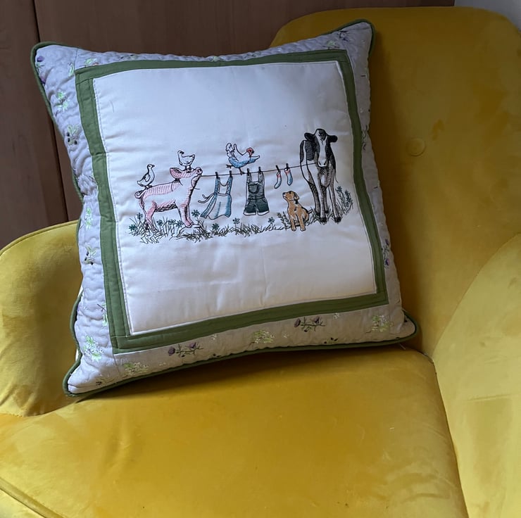 An embroidered cushion that shows all the fun on the farm