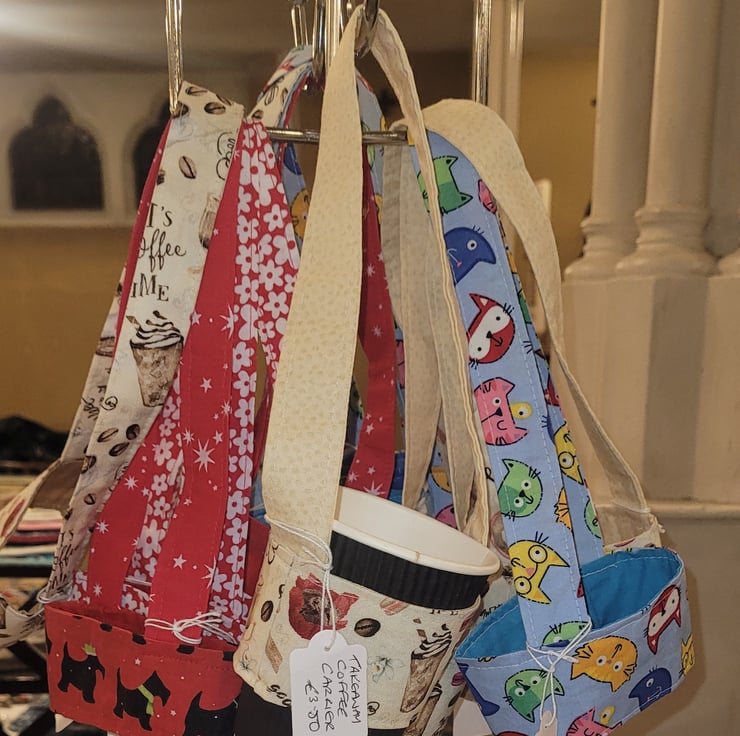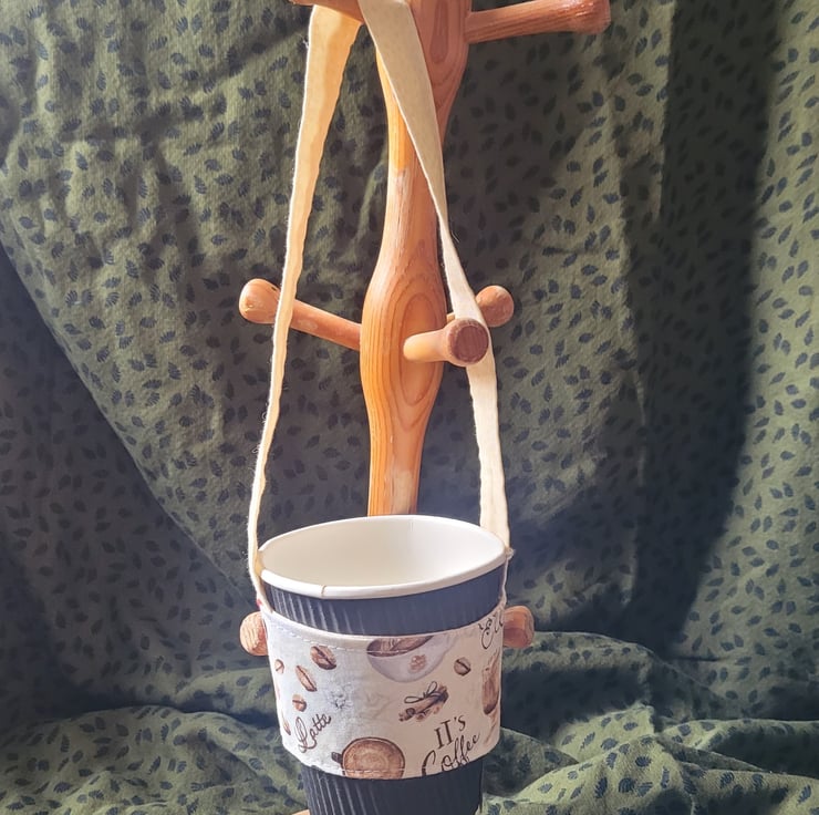 A handy carrier for takeaway coffees and other drinks. Carry several cups at once, each in it's own carrier. An easier way to do the coffee run, leaving your hands free for other things, like opening doors.
