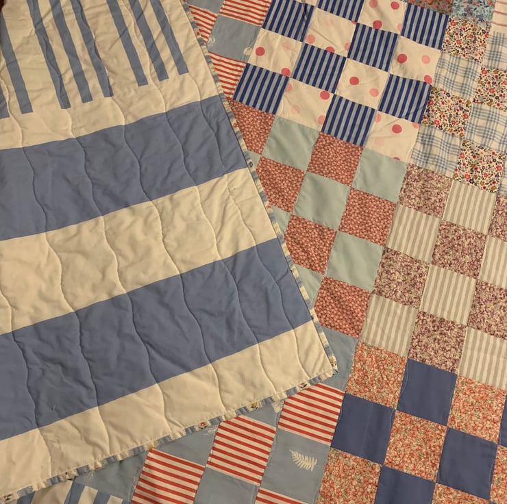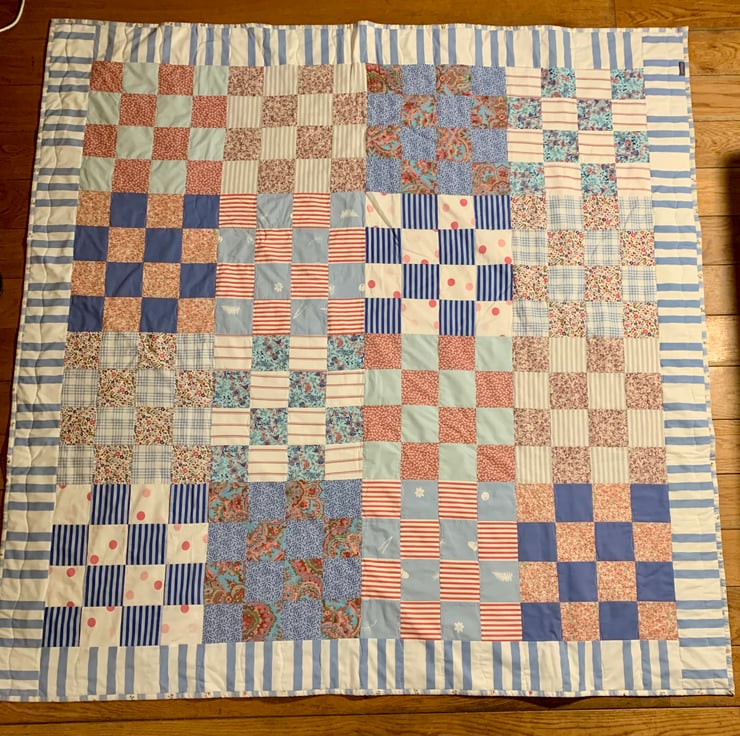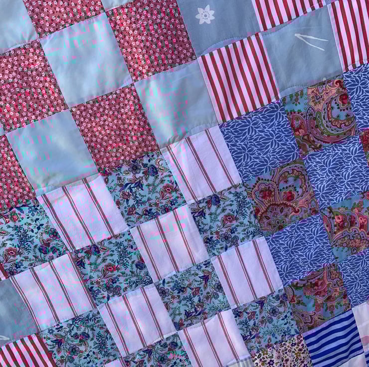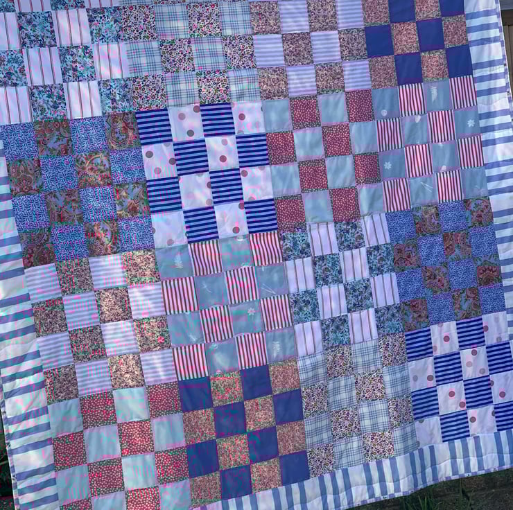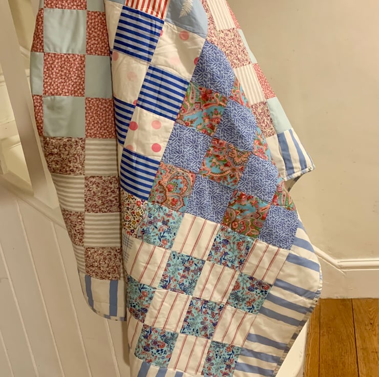 Delightful 16 patch, floral and stripy, patchwork quilt. Using a selection of blues, pinks and whites to create a wonderful overall checkerboard effect.