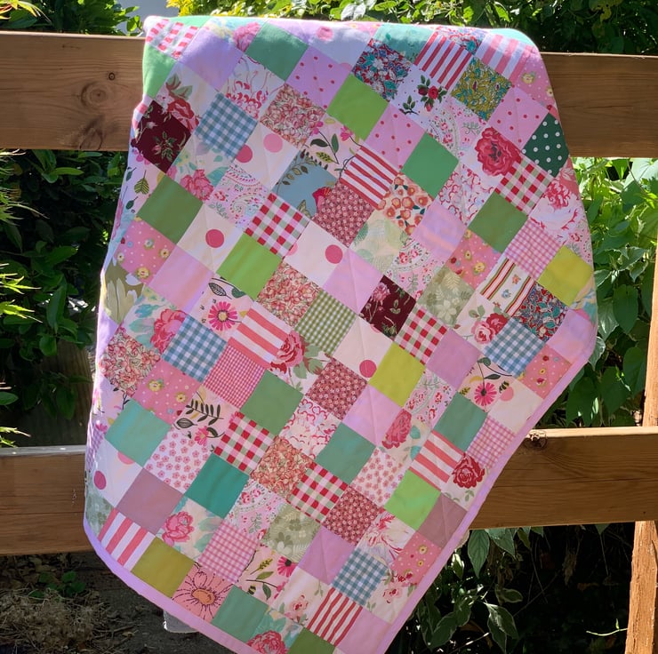 Charming baby quilt in a pink and green checkerboard design with a pink and white floral backing.