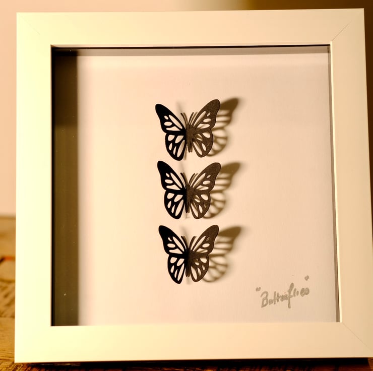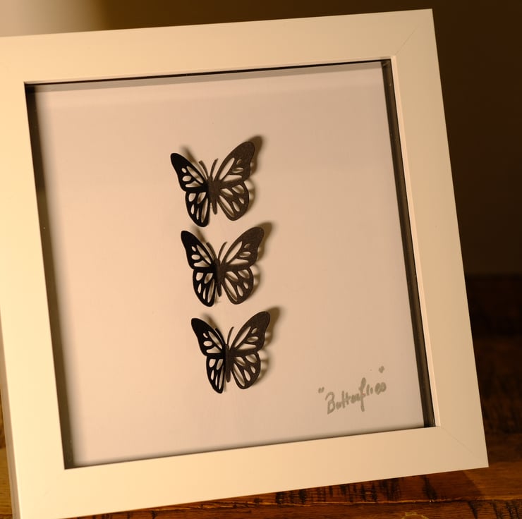 Beautiful box frame with 3 black paper butterflies. I think this is incredibly pretty and as the light moves around so does the shadow. The box frame measures 17.5x17.5cm and can be hung or placed on a flat surface.