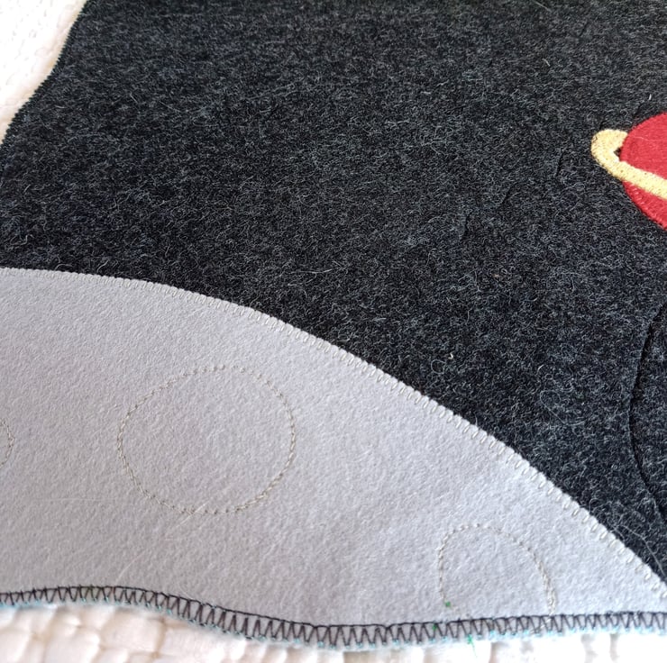 Made for soft wool felt, and small enough to roll up in a bag and take on journeys and holidays as well as using at home, the mats are securely machine stitched to hold all the layers and to add decorative features and contours. Additional features are added with cotton print inserts.