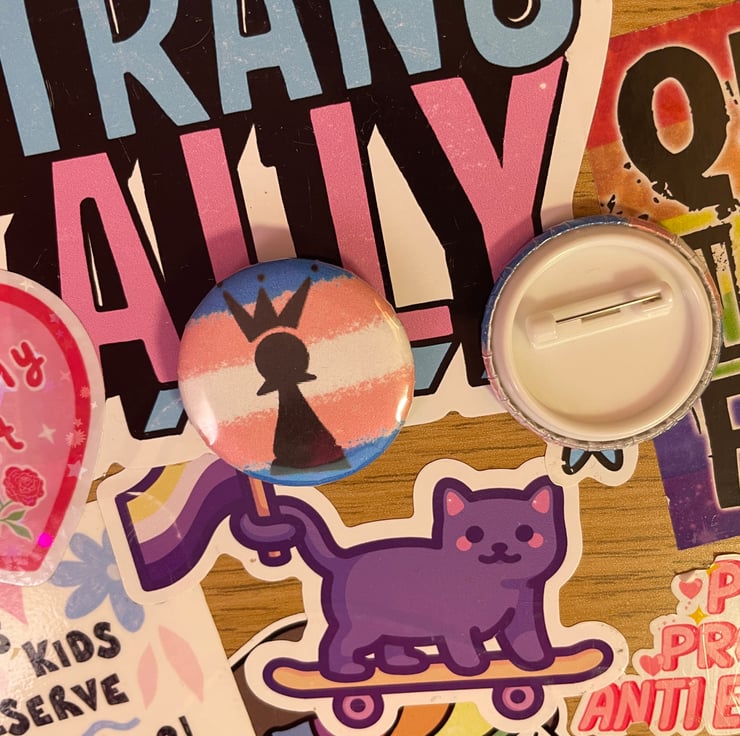After learning about Trans Kids Deserve Better on instagram, we went to see them at their Dept for Education sit-in and then met them again at Bristol Trans Pride. I wanted to do something to fundraise for this amazing group of young people, and they agreed we could make and sell badges of their logo to fundraise for them! Yey!