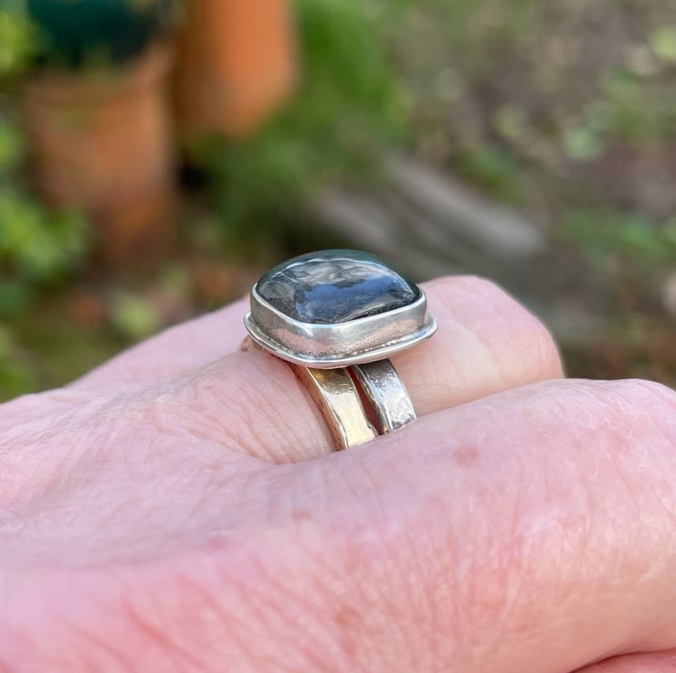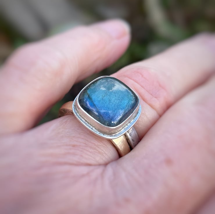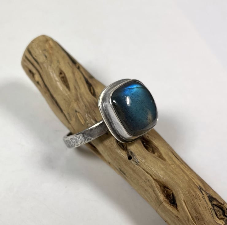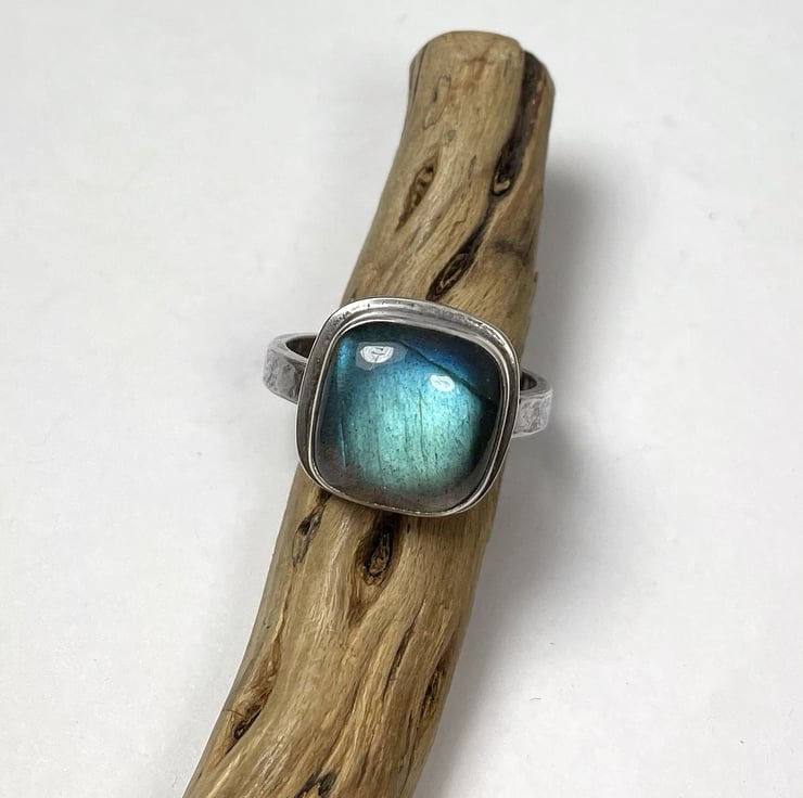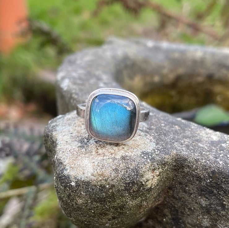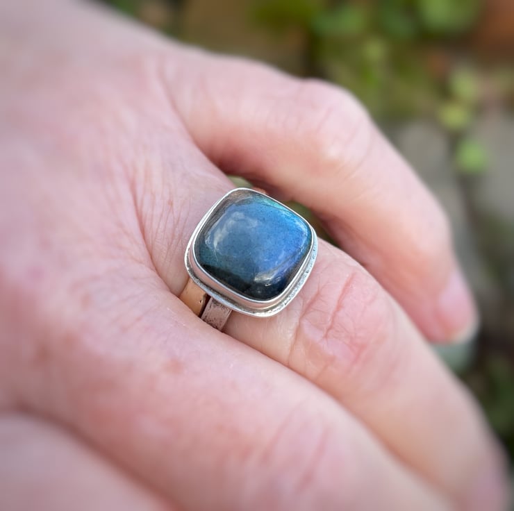 A square cushion cut labradorite cabochon, simple set in an oxidised silver ring U.K. size