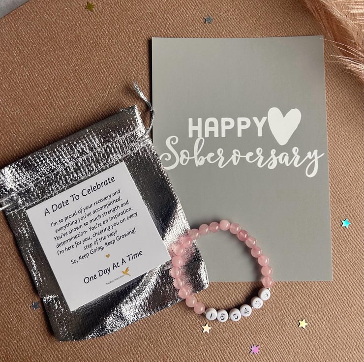 This handmade bracelet is made using the highest quality gemstone beads (6mm) and the sobriety date sits between silver spacer beads. Comes with a small Date To Celebrate Card and protective pouch. Choose which A6 encouragement card you wish to include and leave a personalised note for inside the gift box if you want to add that extra personal touch!
