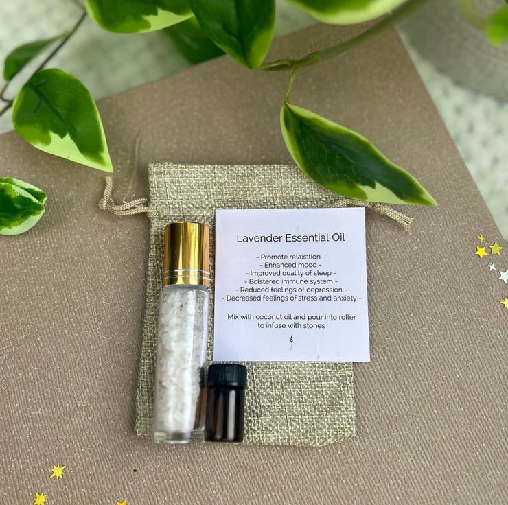 - An Amethyst or Rose Quartz stone essential oil roller bottle and 2ml tester bottle of pure Lavender Essential oil (instructions to mix with coconut oil and can wear throughout the day to stay calm and relaxed)