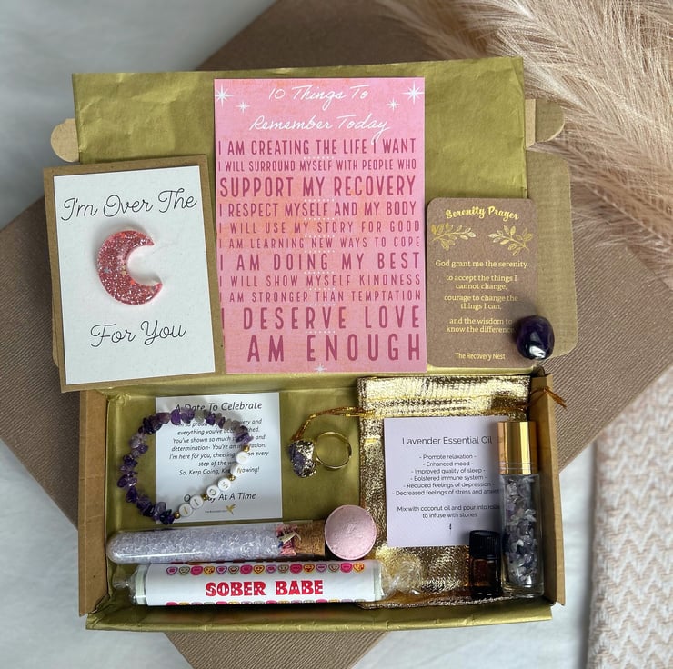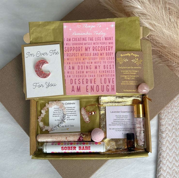 Gift Someone (or yourself) this beautiful sobriety gemstone recovery box with bracelet, essential oils and bath salts.