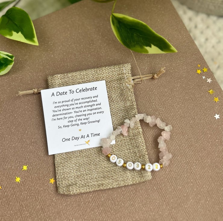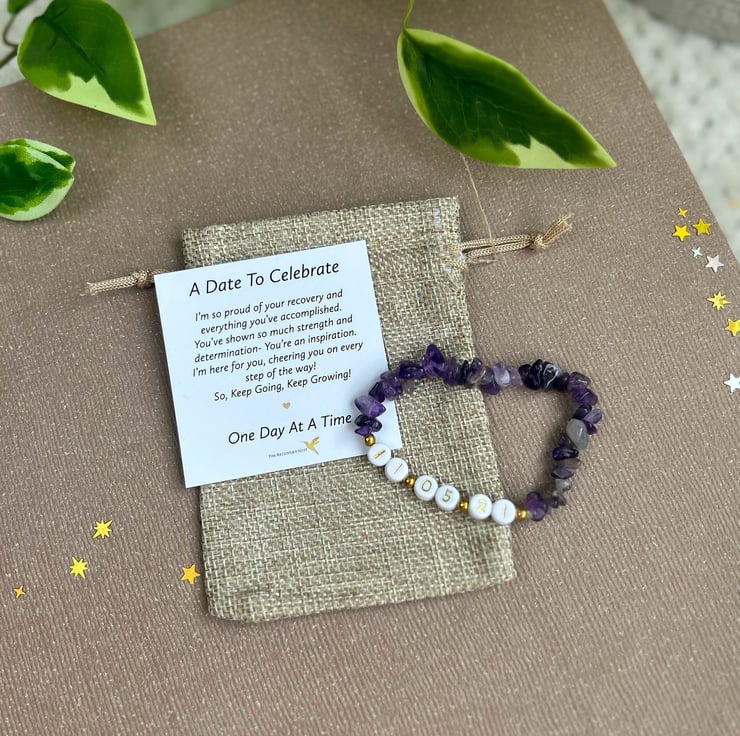 -A Rose Quartz or Amethyst Stone Recovery Band with personalised sobriety date on and backing card, comes in a burlap pouch.