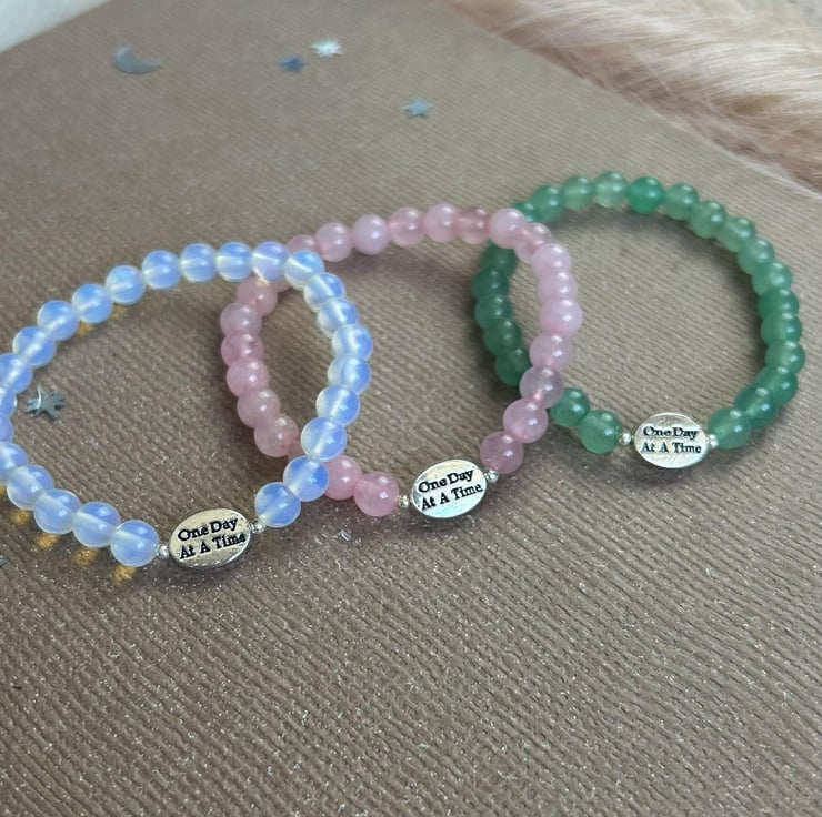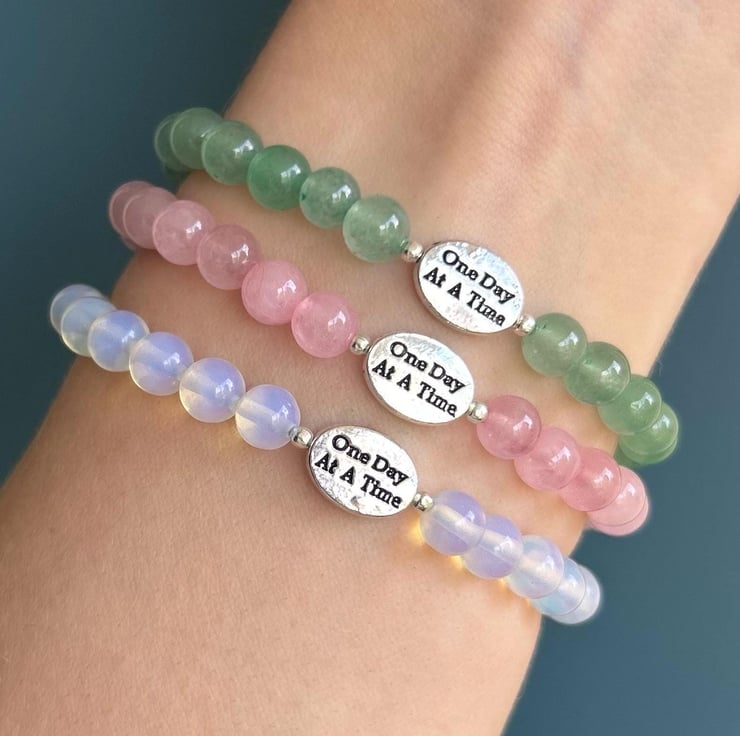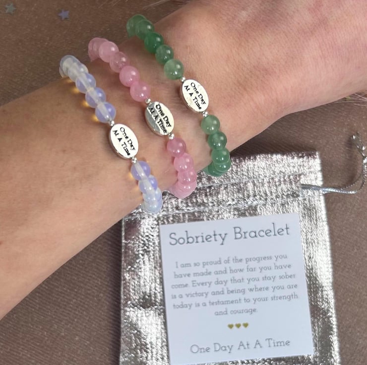 Treat yourself of someone overcoming addiction today with one of these handmade bracelets made from a choice of natural gemstone beads. The silver plated One Day At A Time charm sits between two silver spacer beads. Comes with a Sobriety Backing Card I have designed, packaged in a velvet pouch.