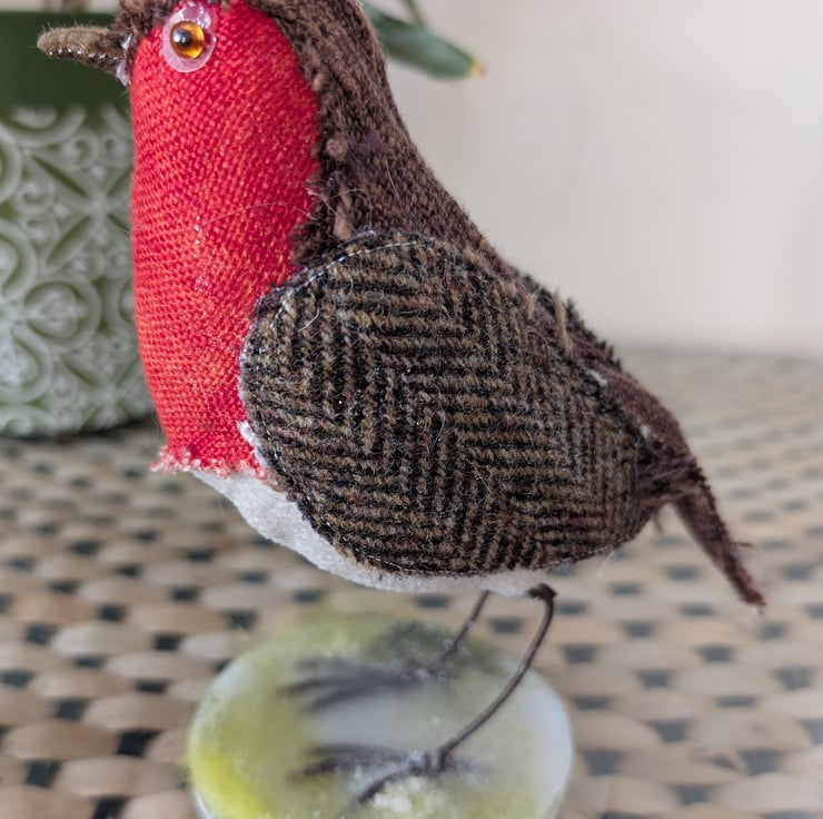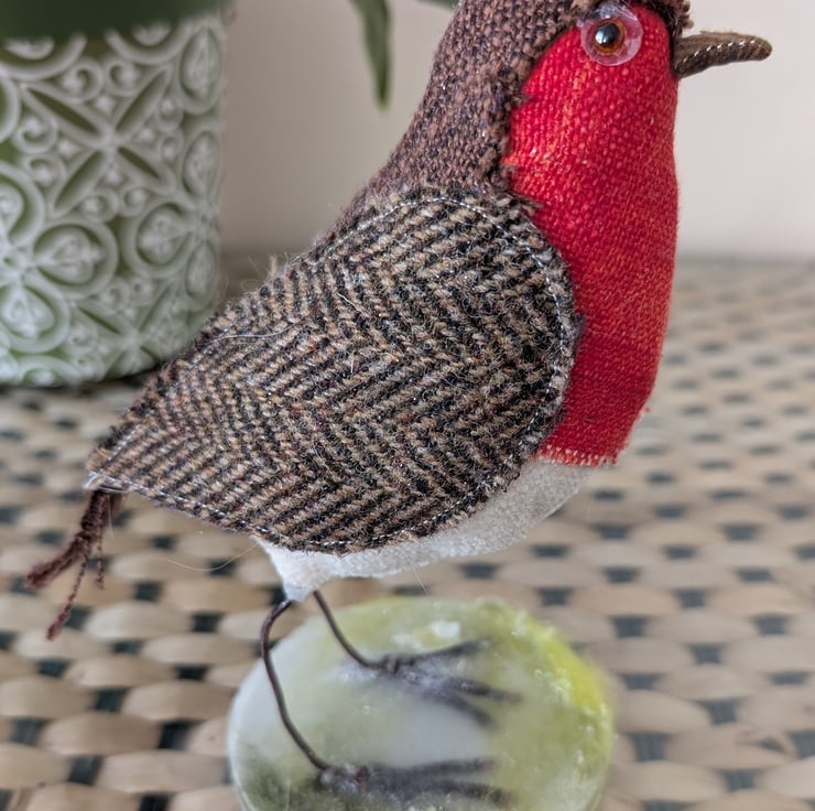 Quirky robin soft sculpture handmade from fabric remnants and other recycled materials. Set in a resin base. Approx 15cm tall.