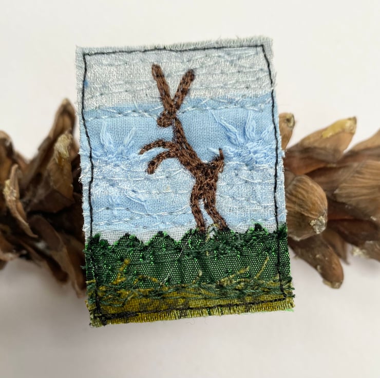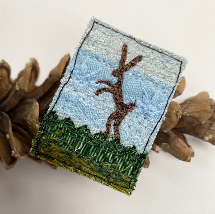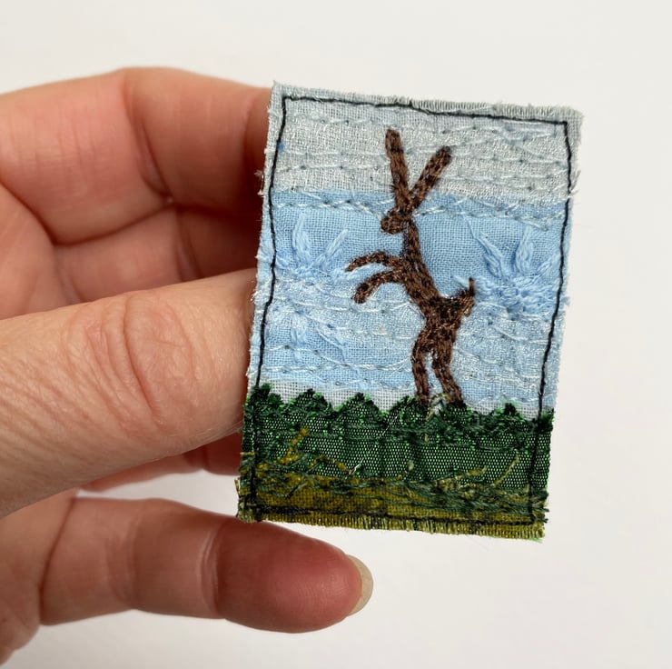 This charming handmade free motion embroidered boxing hare brooch is made from up-cycled pre felt. It is felt backed, and has a brooch pin with hook on the reverse to keep it nice and secure. It measures 5 x 3.5cm approx.