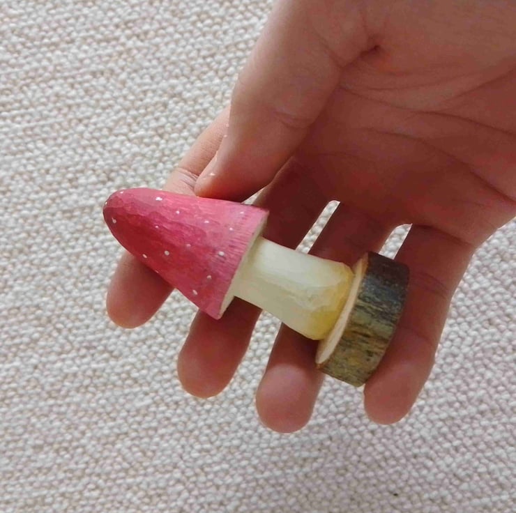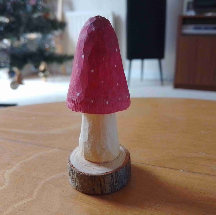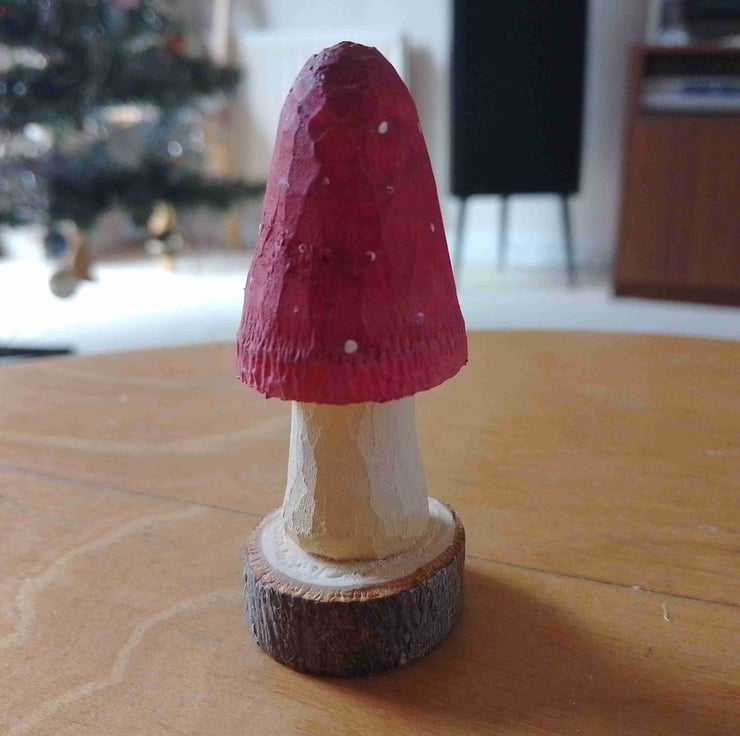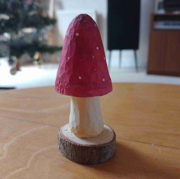 This nice red mushroom has been carefully whittled from a branch of the basswood tree in my front garden. It stands 7.8 cm tall and has been finished with Graduate acrylic paint.