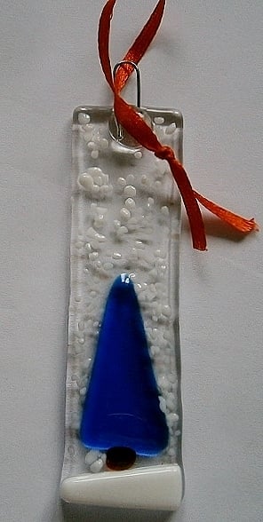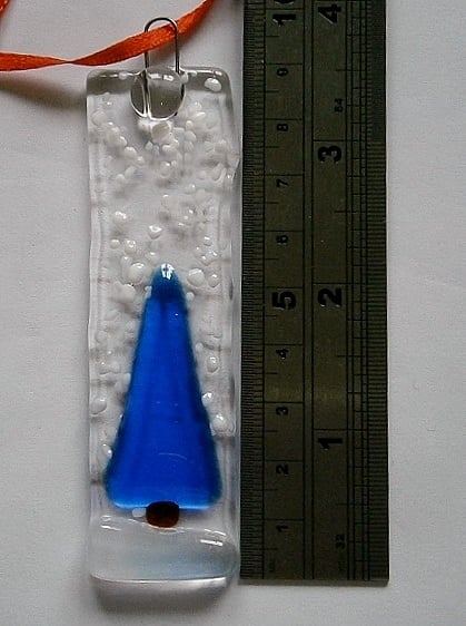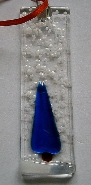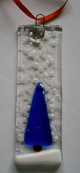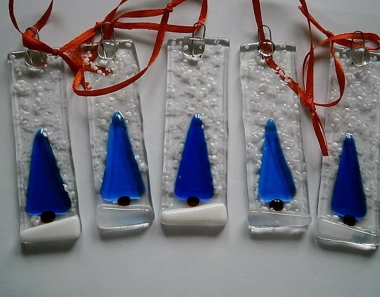 Hand made snowy tree Christmas decorations made by fusing glass.