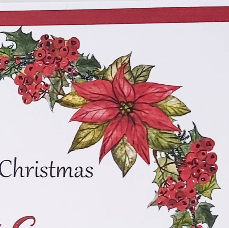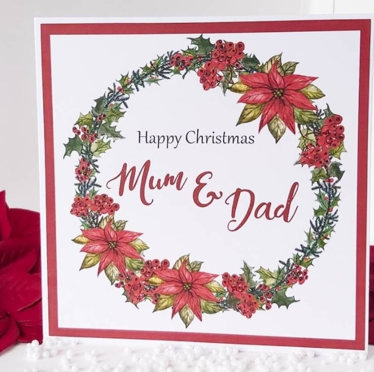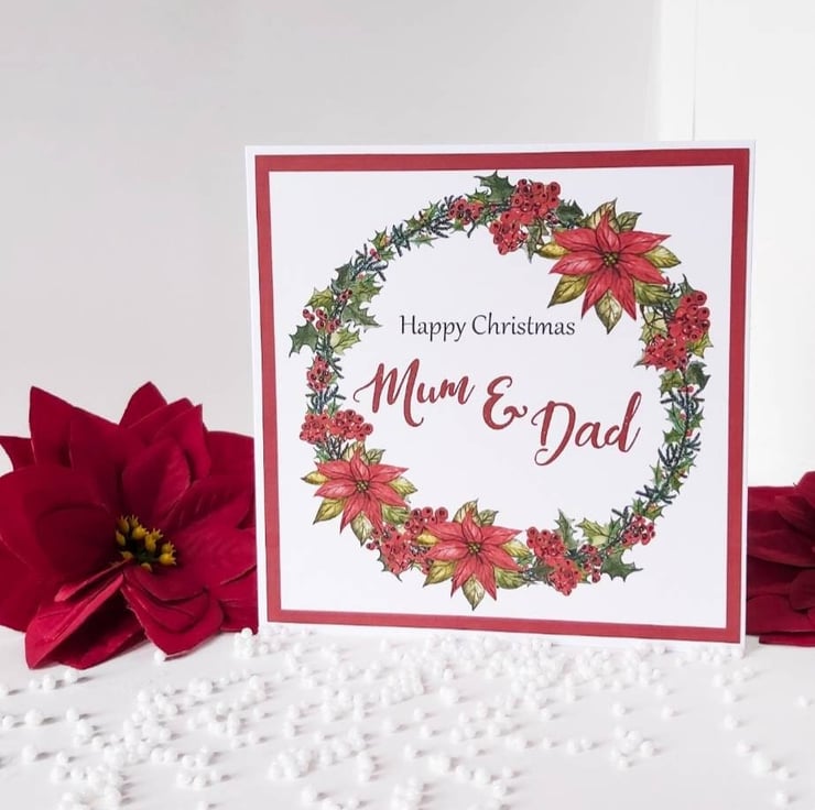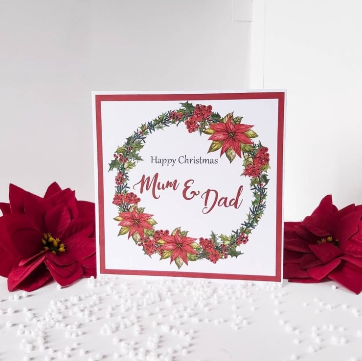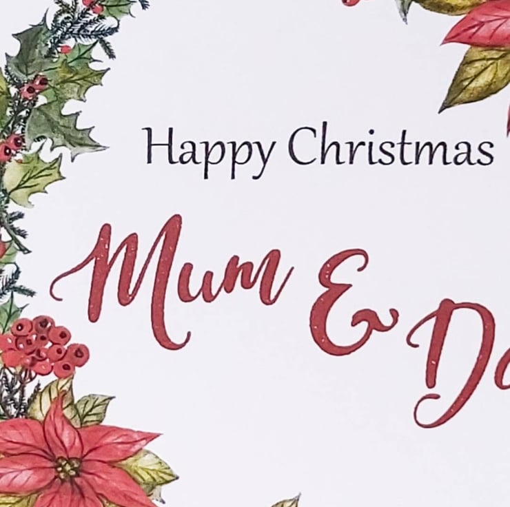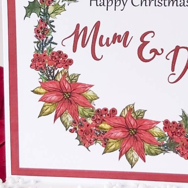 This beautiful mum and dad Christmas card decorated with a poinsettia wreath is the perfect card for those extra special parents this Christmas.
