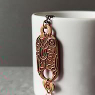 Small dangly seaglass earrings made from bronze metal clay, 3 cms from hook to base. The earrings are textured front and back using lino-cutting techniques, the patina highlights the raised lines. The fittings are surgical steel- email me if you would prefer sterling silver.