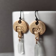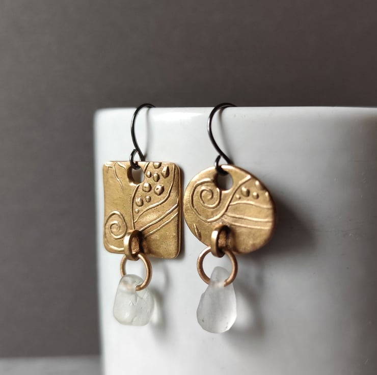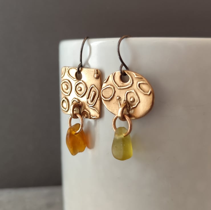 Mis-match Bronze and seaglass drop earrings, recycled material