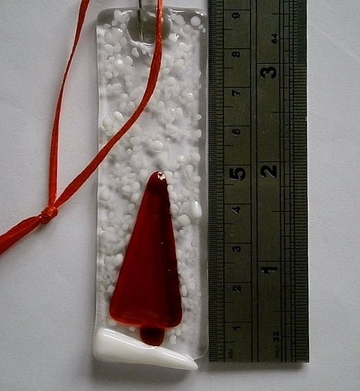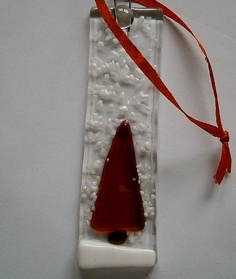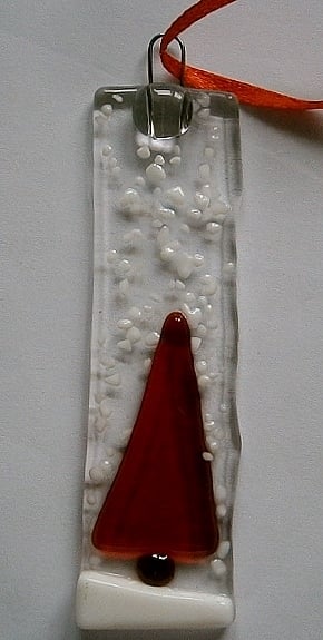 Hand made snowy tree Christmas decorations made by fusing glass.