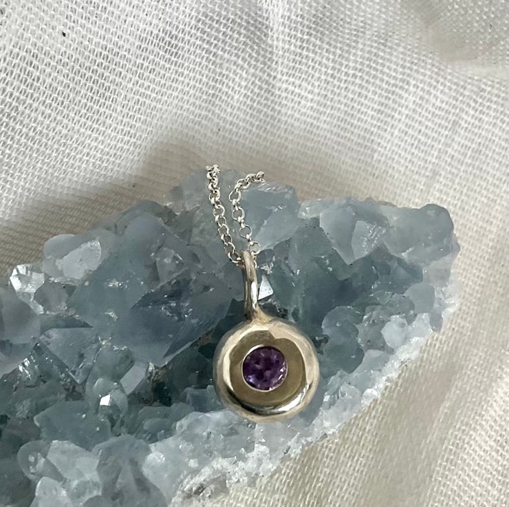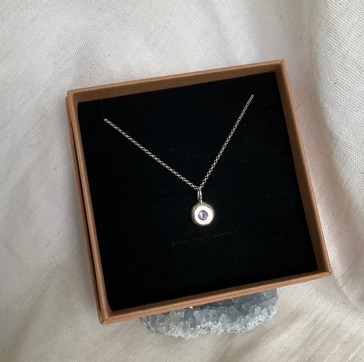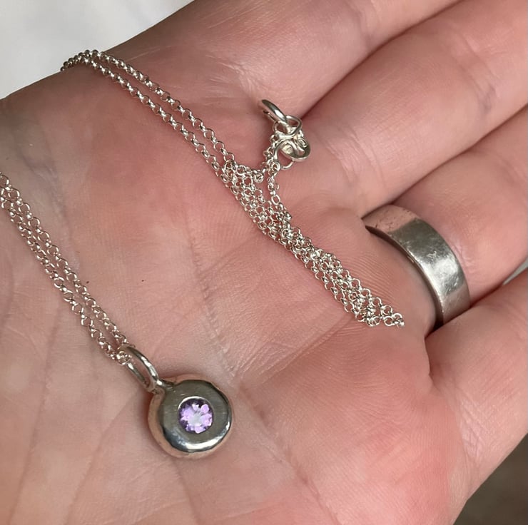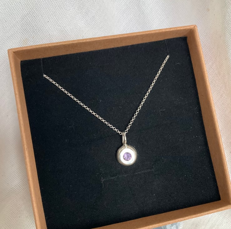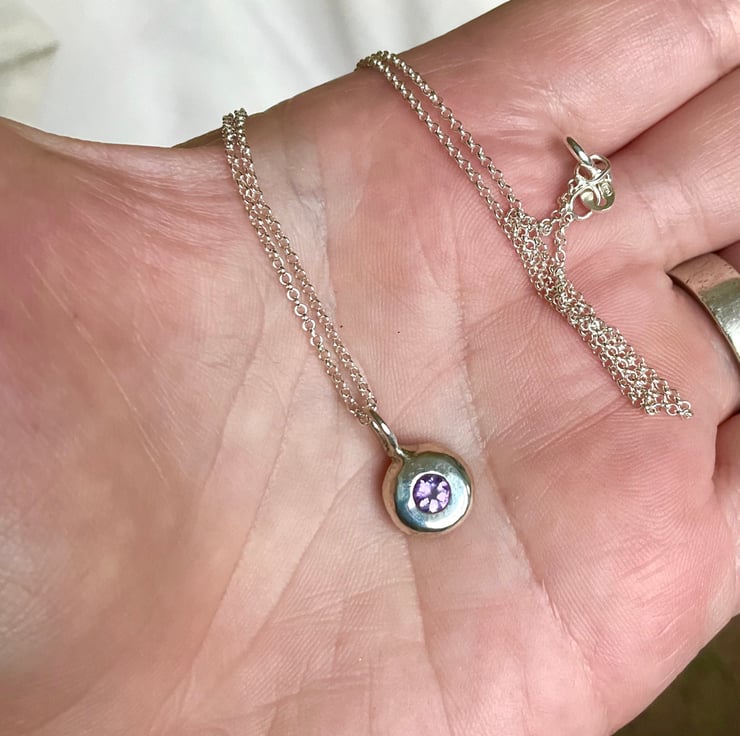 A delightful starling silver pebble pendant inlayer with a little coloured gem, in this case pretty faceted Purple/ Lilac African Amethyst. Included in the price is a delicate 18” silver belcher chain.